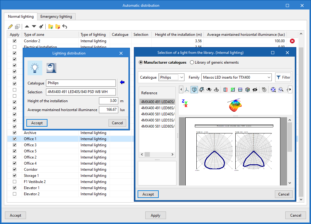Une fois ces paramètres configurés, le logiciel effectue automatiquement une ‘Distribution par zone’ des luminaires intérieurs, extérieurs et/ou de secours dans toutes les pièces correspondantes, en appliquant les critères définis pour chaque type de zone.