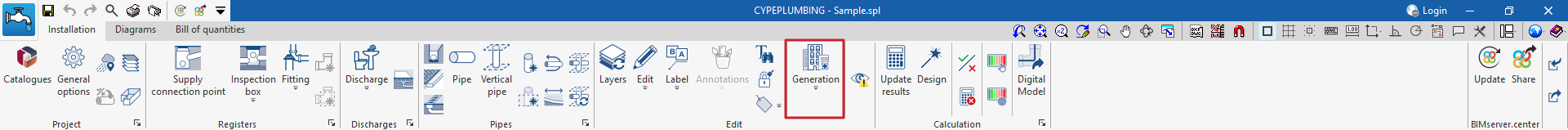 Les options pour la génération automatique du tracé des tuyauteries se trouvent dans le nouveau bloc ‘Génération’, dans l'onglet ‘Installation’.
