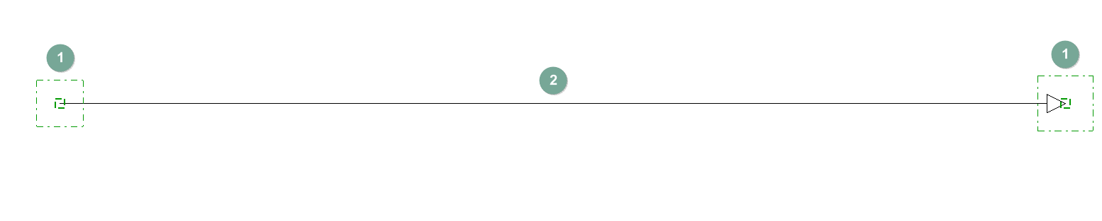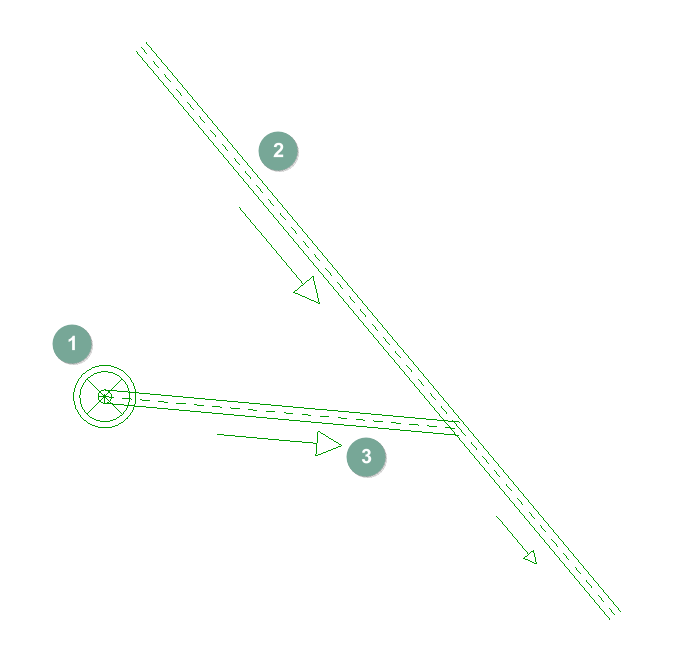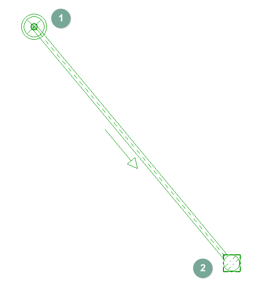 - Saisie manuelle du ‘Tracé horizontal des tuyauteries’ (2) entre les centres des éléments, en suivant la géométrie et la direction souhaitées par l'utilisateur (dans cet exemple, le trajet est situé entre le centre d'un regard et celui d'un autre).