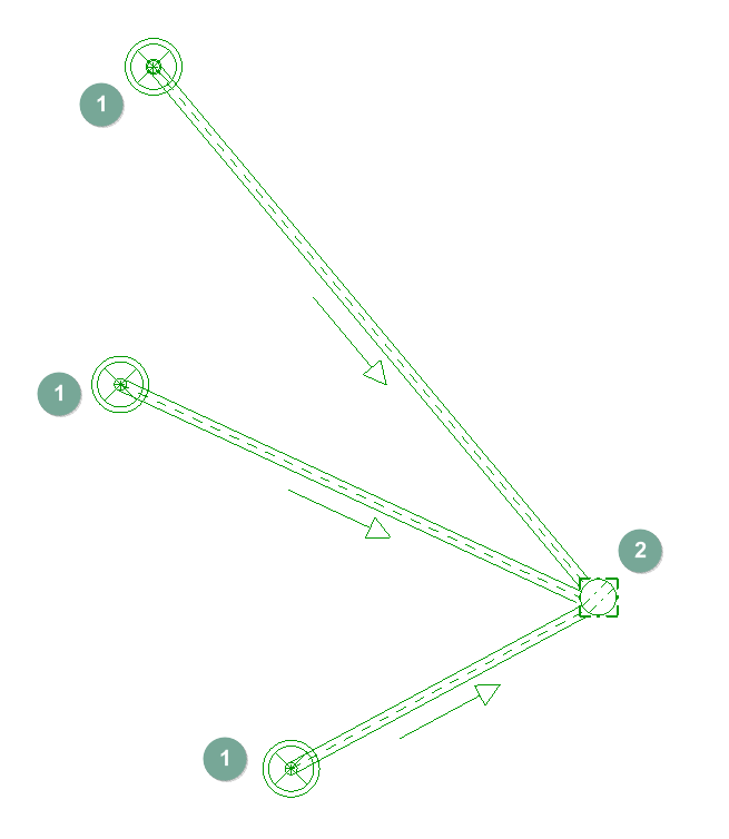 - Sélectionnez avec le bouton gauche l'élément de type regard (comme le tabouret siphoïde) (2) saisi manuellement. En conséquence, les tuyauteries sont automatiquement générés depuis les raccordements jusqu'aux connexions disponibles de l'élément de type regard (3), qui sont réparties autour de celui-ci de manière radiale.