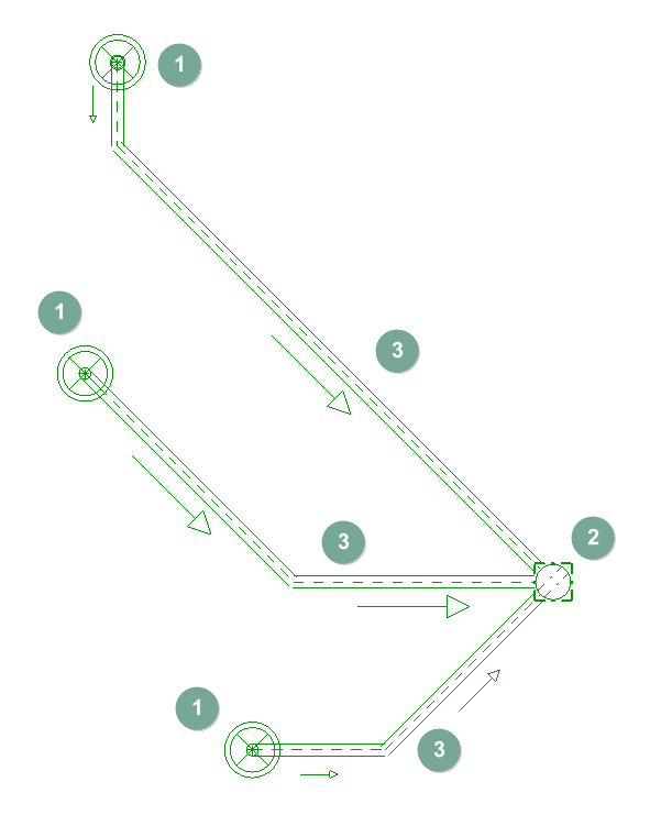 - Sélectionnez avec le bouton gauche la dérivation (2) introduite manuellement. En conséquence, les tuyauteries individuelles (3) sont générées automatiquement depuis les raccordements jusqu'à la dérivation, en la raccordant à 45 degrés.