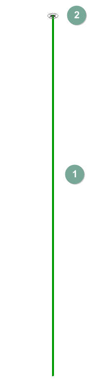 - Sélectionnez le pas de pose vertical des tuyauteries avec le bouton gauche. En conséquence, la tuyauterie (1) est automatiquement générée en suivant le tracé de la gaine technique. De plus, le logiciel dispose d'un ‘Terminal d'aération’ (2) à son extrémité supérieure.