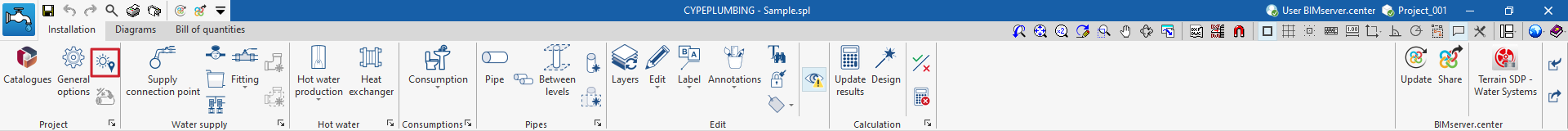 L’option permettant de définir la commune dans le projet de l'installation d’approvisionnement en eau se trouve dans l'onglet ‘Installation’ de la section ‘Water Systems’, dans les ‘Options générales’ du bloc ‘Projet’ de la barre d'outils principale :