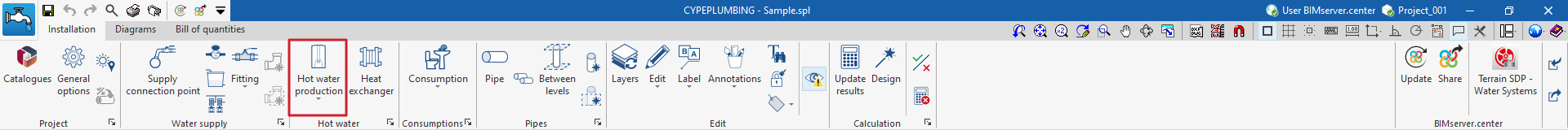 L'option qui permet d'insérer des équipements de production d'eau chaude sanitaire (ECS) dans l'installation d'approvisionnement en eau se trouve dans l’onglet ‘Installation’ de la section ‘Water Systems’ du bloc ‘E.C.S.’ de la barre d'outils principale :