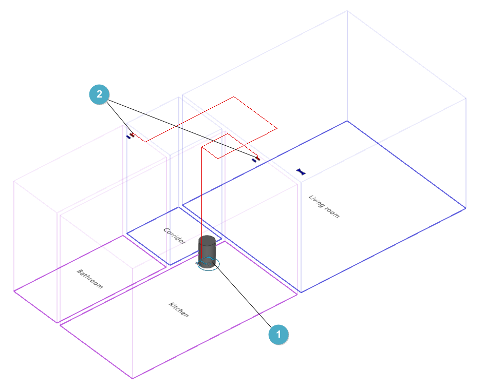 | Un exemple d'utilisation peut être donné dans la conception d'une installation disposée à travers le sol de deux locaux (à cette fin, l'option ‘Par le sol’ doit être cochée dans la configuration de son type). Pour que les tuyauteries passent directement d'un local à l'autre, au lieu de rechercher la position de la porte, un ‘Passage horizontal des tuyauteries’ peut être introduit dans la zone où se trouve la cloison entre les deux locaux. |