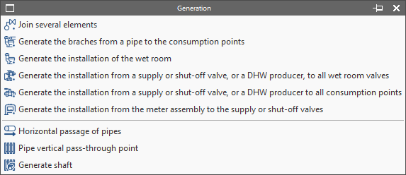 Génère les tuyauteries depuis le robinet après compteur, la vanne de coupure ou le producteur d'ECS sélectionné jusqu'aux vannes de local humide préalablement introduites.