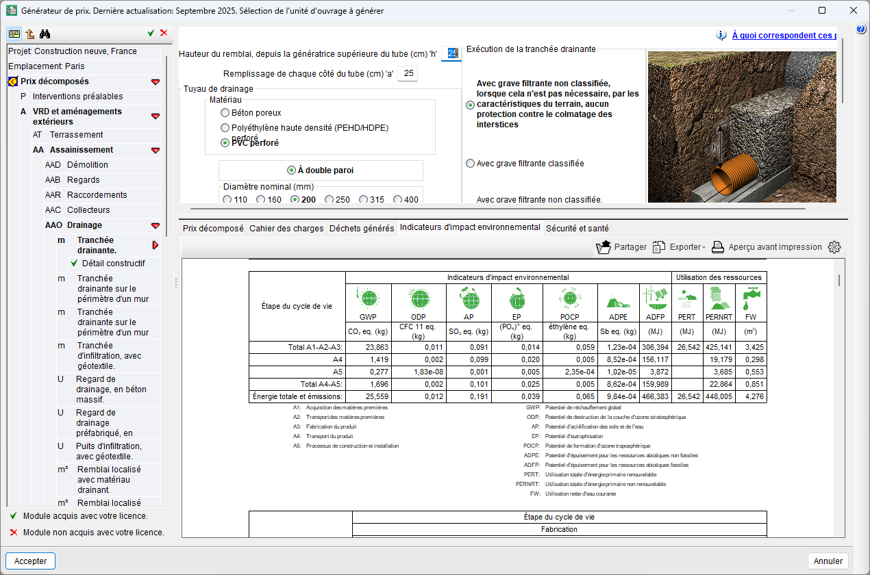 Les valeurs de tous ces paramètres résultent de la mise en œuvre de chaque unité de travail depuis les étapes de fabrication (A1, A2 et A3) et de construction (A4 et A5), et sont ventilées par matériaux, emballages, matériel, frais de chantier des unités d'ouvrage et déchets. Ces informations peuvent être consultées dans le Générateur de prix, sous l'onglet ‘Indicateurs d'impact environnemental’ de chaque unité d’ouvrage.