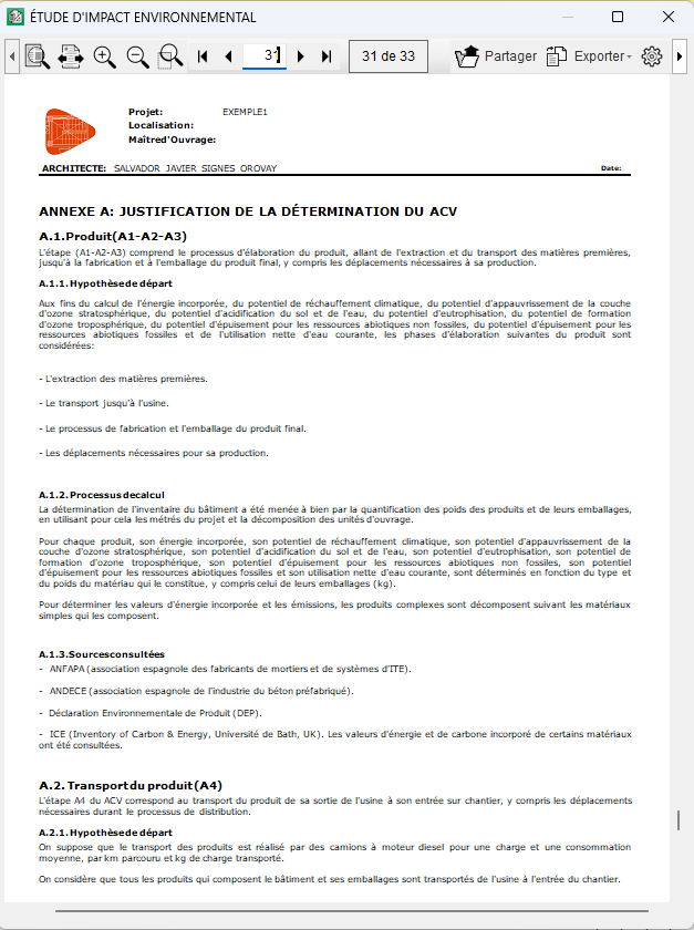 Il comprend une annexe qui justifie en détail la détermination de l'ACV du produit (A1, A2 et A3), du transport du produit (A4) et du processus d'installation du produit et de construction (A5). Chacune de ces phases comprend :