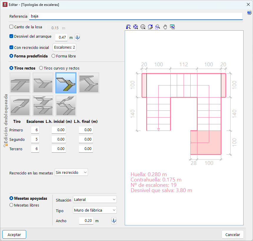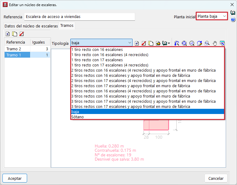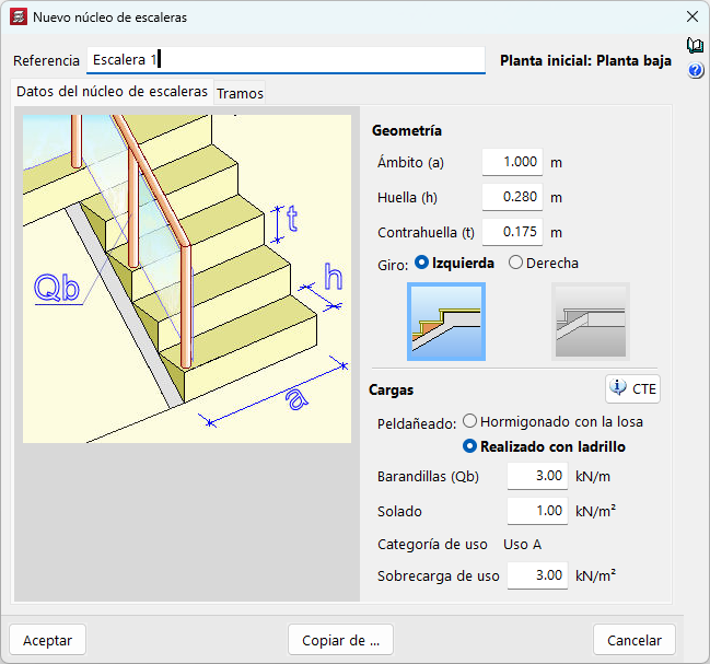 Dans le module ‘Escaliers’ du logiciel CYPECAD la possibilité d'introduire des plans courbes sur les escaliers a été implémentée. Maintenant, les ‘Formes prédéfinies’ d’escaliers comprennent: