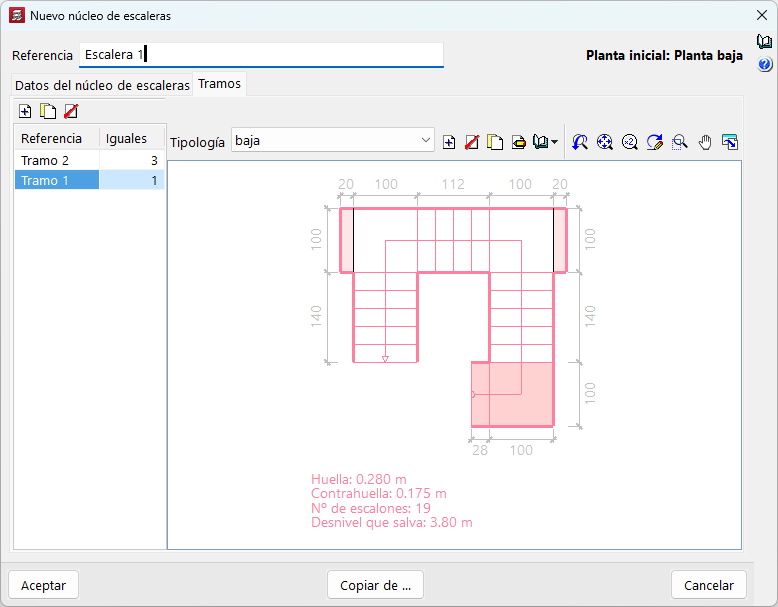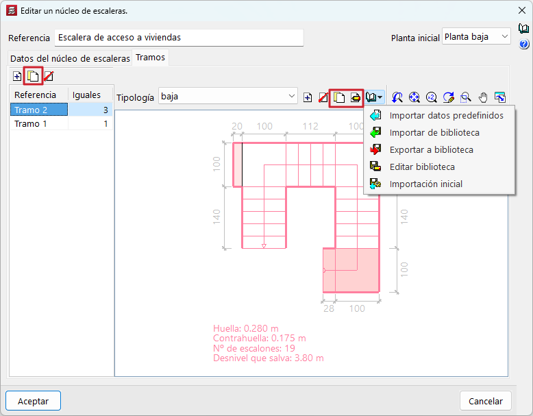 Il est possible de copier les données d'autres noyaux d'escalier du même ouvrage pour les modifier et introduire de nouveaux noyaux. Le logiciel dispose de typologies de tronçons d'escalier prédéfinis qui peuvent être utilisés dans le noyau à définir par l'utilisateur avec des changements mineurs. Il est également possible de copier des tronçons au sein d'un même noyau d'escalier et il existe une bibliothèque de typologies de volées d'escalier pouvant être élargie avec les données de l'utilisateur pour être utilisées dans d'autres ouvrages.