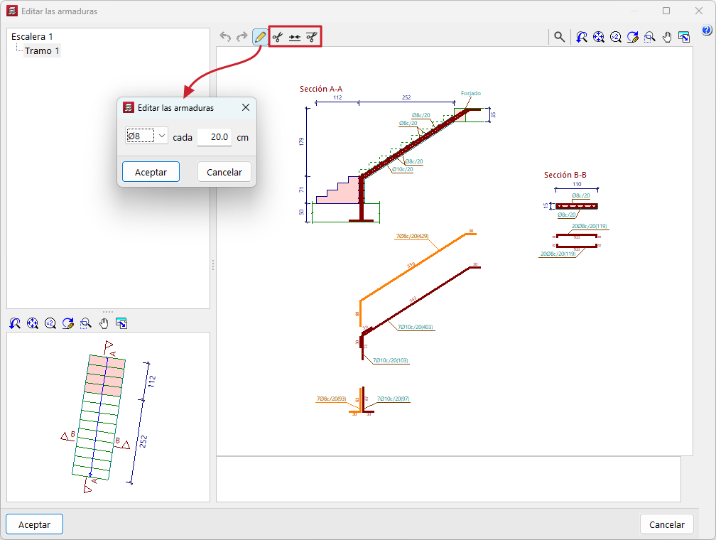 Le module « Escaliers » de CYPECAD dispose également de l'option 'Éditer les armatures'. Elle permet de modifier le diamètre et l'espacement des armatures supérieure et inférieure de chaque section. Une fois la modification effectuée, il est vérifié si les armatures disposées sont suffisantes. Si l'une des armatures n'est pas suffisante, les alertes correspondantes s'affichent.
