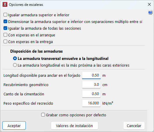 Le béton utilisé dans les noyaux d'escalier est le même que celui sélectionné pour les planchers, bien que le type d'acier utilisé dans leur armature puisse être spécifique à celles-ci. Le logiciel dispose de deux tableaux d’armatures (longitudinal et transversal) exclusivement pour les escaliers que l'utilisateur peut configurer à sa guise.