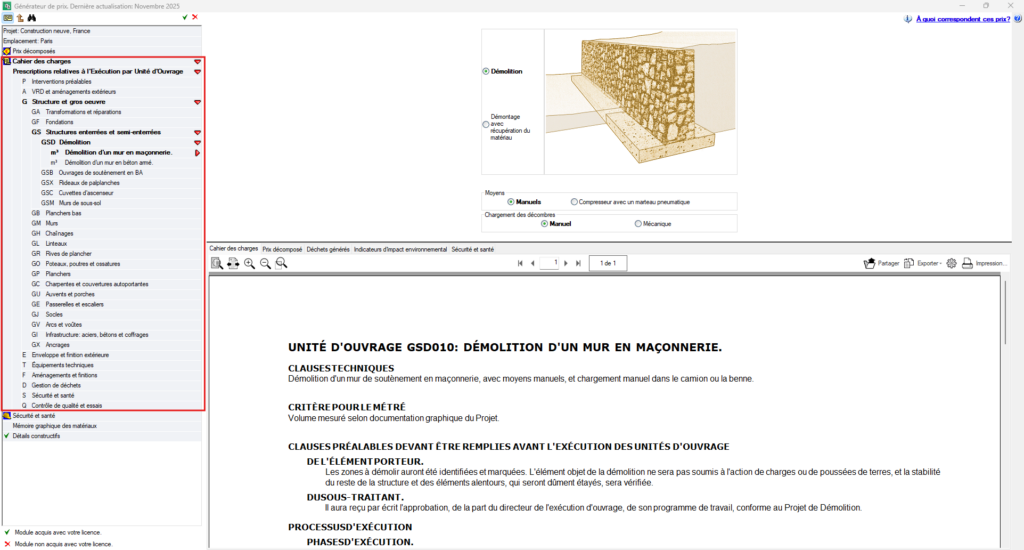 La section ‘Cahier des charges’ présente les prescriptions relatives à l’exécution des différentes unités d’ouvrage. Ces informations sont essentielles pour garantir que les solutions proposées sont conformes aux exigences légales et techniques applicables dans le pays concerné.