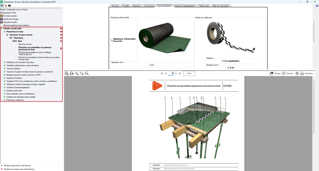 La section ‘Détails constructifs’ fournit les détails constructifs des unités d’ouvrage du Générateur de prix, avec la possibilité de sélectionner les paramètres spécifiques qui y interviennent. Il est possible d'imprimer ou d'exporter le détail graphique avec sa légende correspondante, qui comprend la description technique et les codes des matériaux qui font partie du détail. Il permet également d'insérer une image d'en-tête prédéfinie ou définie par l'utilisateur, et d'imprimer les détails en couleur, en échelle de gris ou avec des lignes et des trames.