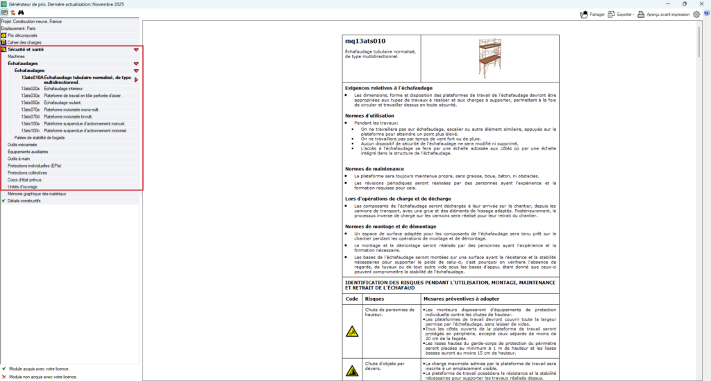 De même, sous la rubrique ‘Prix décomposés’, des informations spécifiques et génériques en matière de sécurité et de santé sont incluses pour chaque unité d’ouvrage.