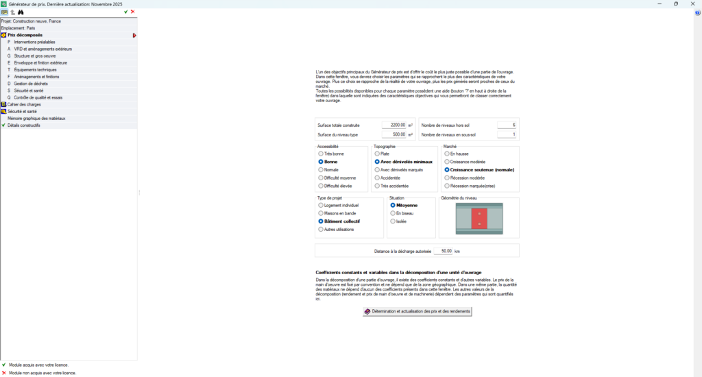 Avant de pouvoir visualiser et exporter les unités d’ouvrage dans la section ‘Prix décomposés ‘, il est essentiel de prendre en considération plusieurs facteurs qui peuvent être anticipés avant le début des travaux. Ces contraintes prévisibles sont déterminantes pour fournir une estimation des coûts la plus précise possible.