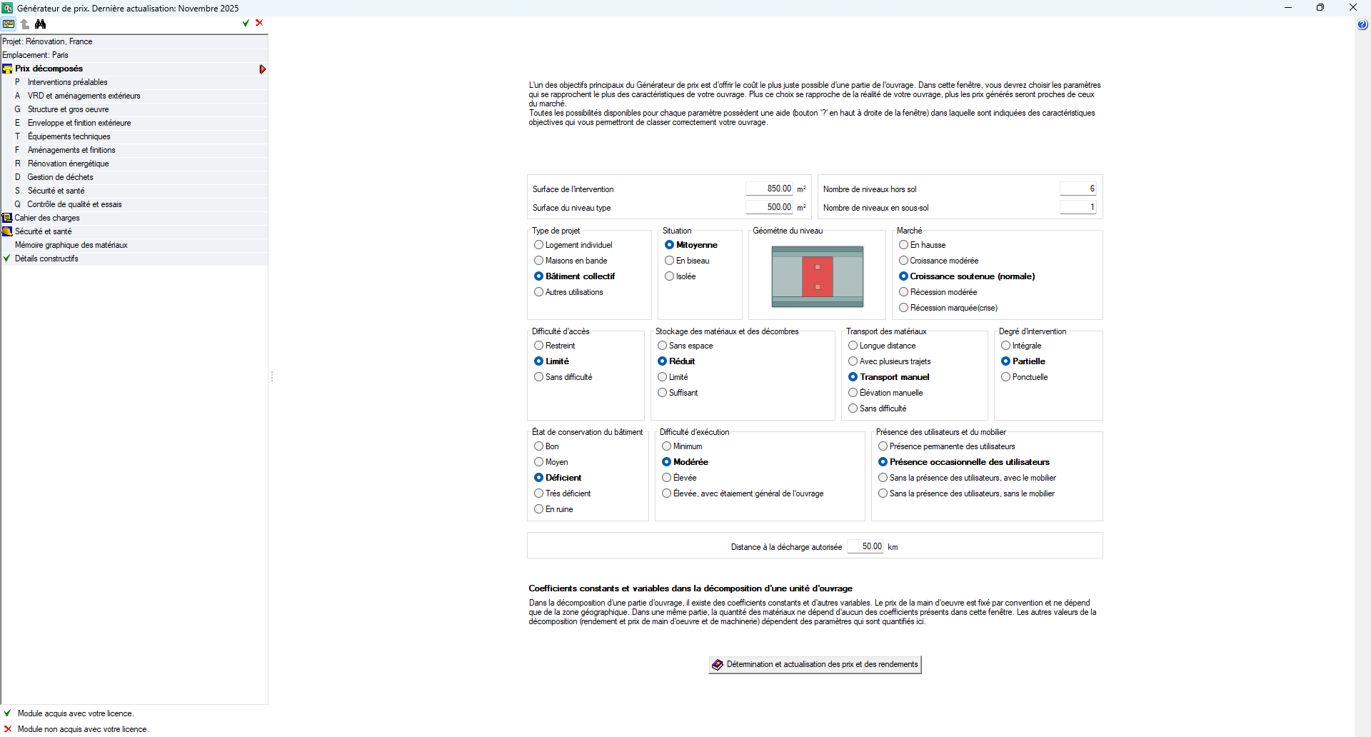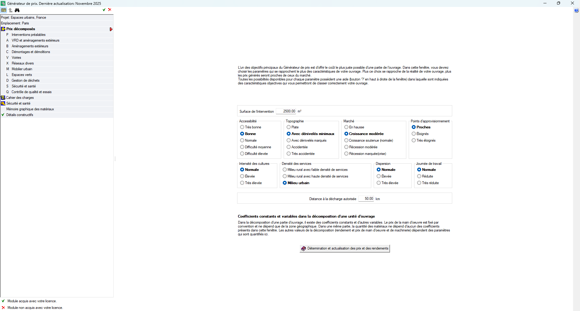 Avant de pouvoir visualiser et exporter les unités d’ouvrage dans la section ‘Prix décomposés ‘, il est essentiel de prendre en considération plusieurs facteurs qui peuvent être anticipés avant le début des travaux. Ces contraintes prévisibles sont déterminantes pour fournir une estimation des coûts la plus précise possible.
