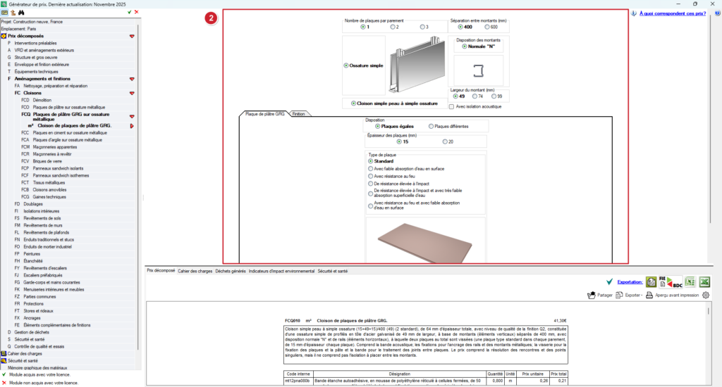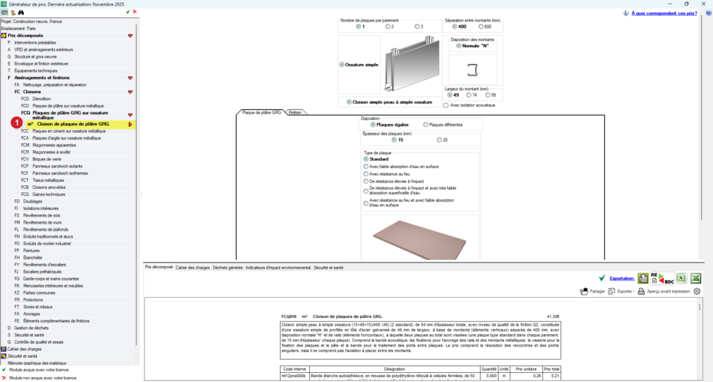 - Dans le menu arborescent, sélectionnez l'unité d'e travail'ouvrage correspondante, par exemple FCQ010 – Cloison de plaques de plâtre GRG.