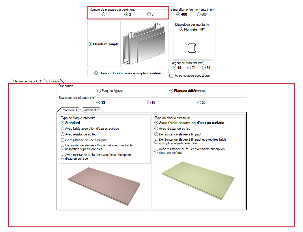 - Nombre de plaques par parament (1, 2 ou 3).