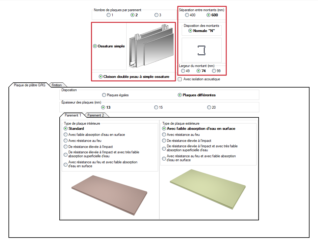 - Type de plaque (standard, avec résistante au feu ou d'une résistance élevée à l'impact).