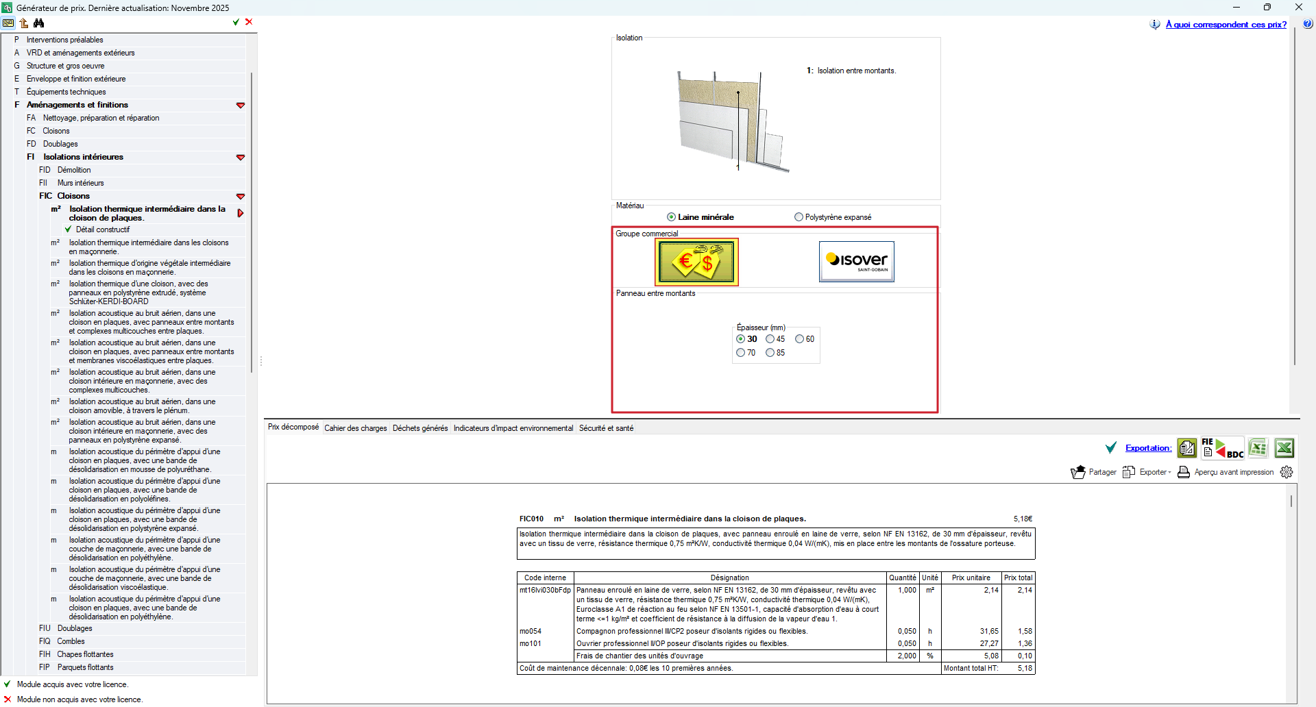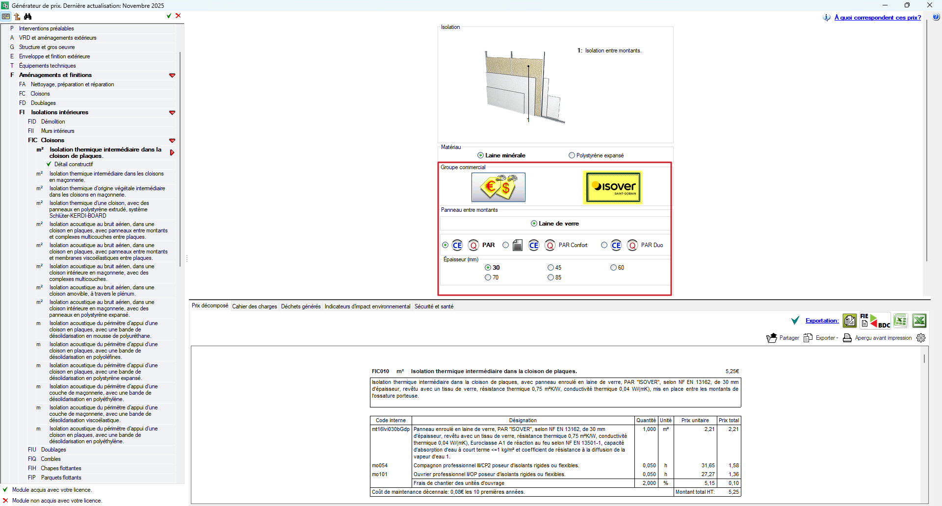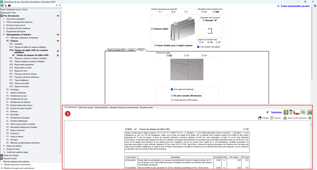 - Au fur et à mesure que ces paramètres sont modifiés, le logiciel génère automatiquement l'unité d'ouvrage correspondante. Dans la partie inférieure de l'interface, les informations des différents onglets sont mises à jour, y compris celles relatives au prix décomposé, ainsi que la documentation associée, ce qui permet de comparer différentes configurations du système de construction avant de l'intégrer au budget.
