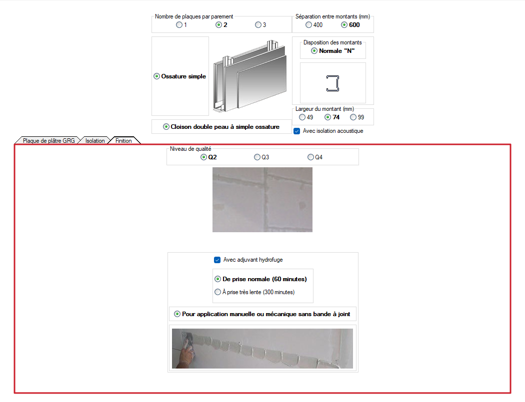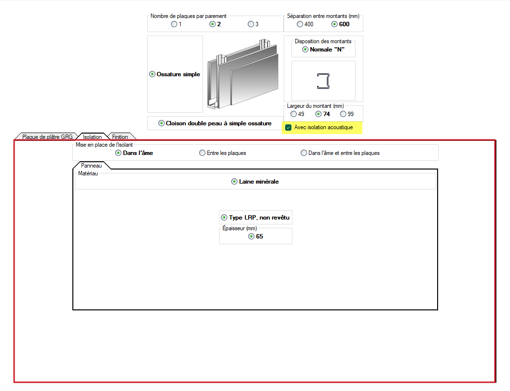 - Inclusion d'isolation à l'intérieur de la cloison et/ou entre les plaques.