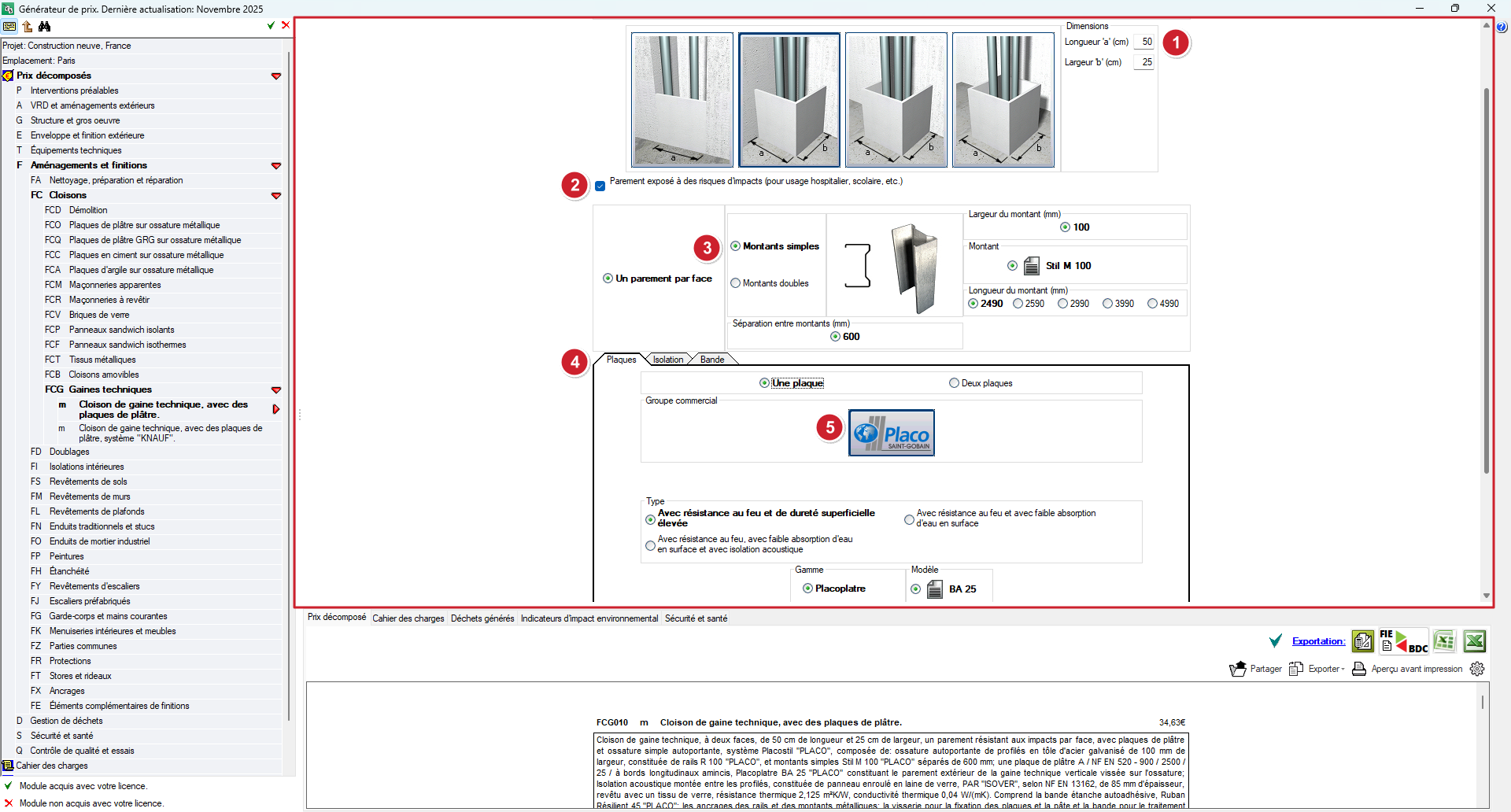 L'unité d’ouvrage cesse d'être une solution générique et s'adapte aux caractéristiques réelles du projet, grâce à la sélection de multiples paramètres techniques tels que les matériaux, les dimensions, les prestations, etc. - Mise à jour automatique du prix