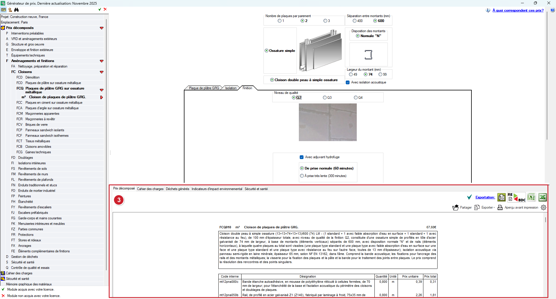 - Dans le menu arborescent, sélectionnez l'unité d'e travail'ouvrage correspondante, par exemple FCQ010 – Cloison de plaques de plâtre GRG.