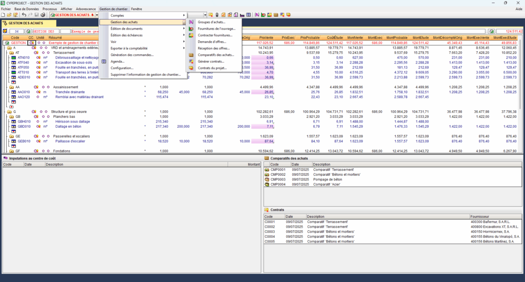 Le module ‘Gestion des achats’ avec le module ‘Contrôle budgétaire de chantier’ de CYPEPROJECT permet de calculer les fournitures nécessaires pour exécuter un ouvrage et prévoir la facturation des fournisseurs et des sous-traitants.