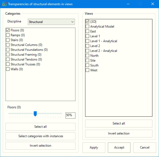 Cette fonctionnalité permet de modifier rapidement le niveau de transparence de différentes catégories dans le modèle Revit, sans avoir à accéder à l'éditeur de visibilité et de graphiques de l'interface. Elle permet également de sélectionner librement les éléments et de définir un pourcentage de transparence modifiable pour une ou plusieurs vues du projet.