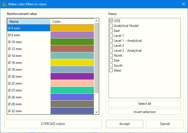 Cette fonctionnalité permet d'attribuer des couleurs aux armatures en fonction de leur diamètre. De cette manière, elles peuvent être appliquées aux vues disponibles sélectionnées sans qu'il soit nécessaire de créer un filtre pour chacune d'entre elles. Les couleurs sont personnalisables et les couleurs utilisées dans le logiciel de calcul original sont également disponibles.