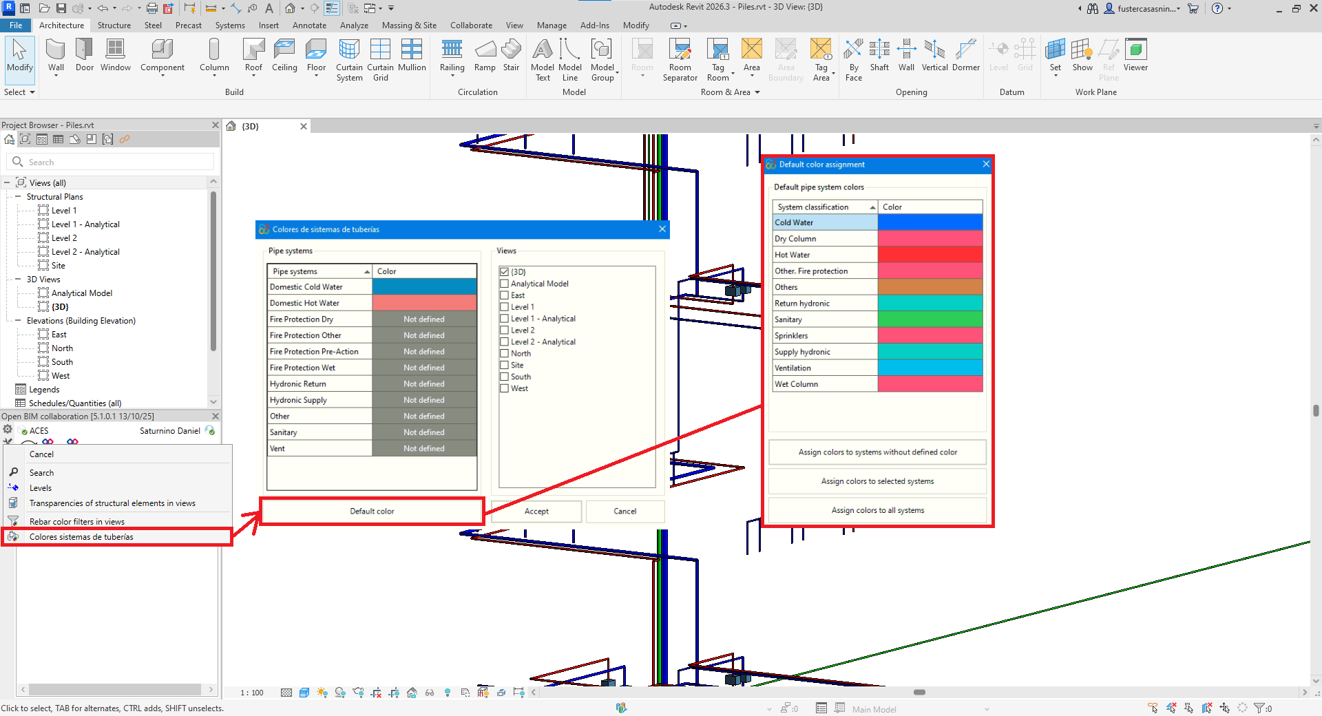 Cette fonctionnalité permet de gérer et de personnaliser les couleurs attribuées aux différents types de systèmes de tuyauteries disponibles dans le modèle Revit. Il facilite également l'identification des systèmes sans couleur définie et offre la possibilité d'appliquer un ensemble de couleurs par défaut de trois manières différentes :
