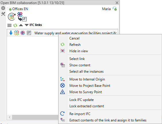 Force la mise à jour du lien IFC, en remplaçant son contenu par la dernière version disponible dans le projet BIMserver.center. - Extraire le contenu du lien vers le document