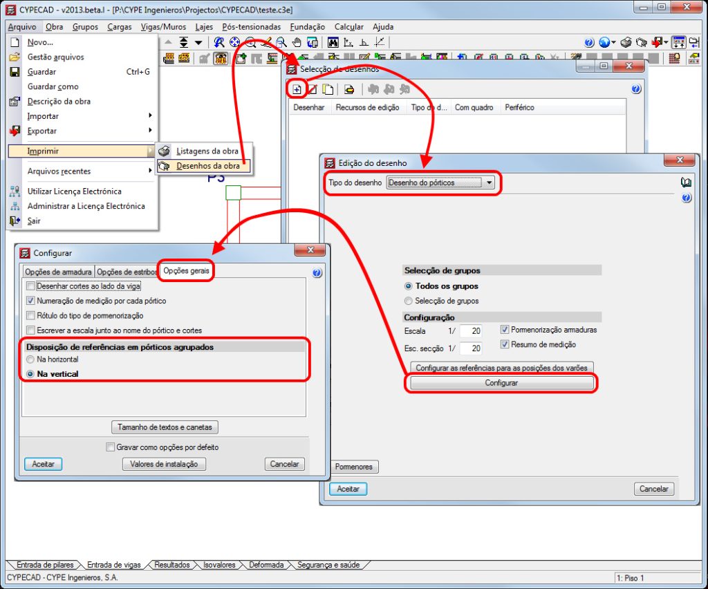 Foi implementada a opção Disposição de referências nos pórticos agrupados (menu Arquivo> Imprimir> Desenhos da obra> botão Acrescentar> seleccionar no "Tipo de desenho" Desenho de pórticos> botão Configurar> separador Opções gerais) que permite colocar as referências dos pórticos agrupados juntos (opção Em horizontal) ou um por baixo de outro (opção Em vertical).