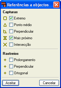 Como nas capturas num ficheiro DXF/DWG, esta opção permite a activação das capturas sobre os objectos do programa (nós e barras). Também se podem configurar os rastreios, por exemplo, com a opção Prolongamento activada, capturar-se-á o prolongamento de uma barra quando se aproxime dela com o cursor, desenhando-se uma linha descontínua.