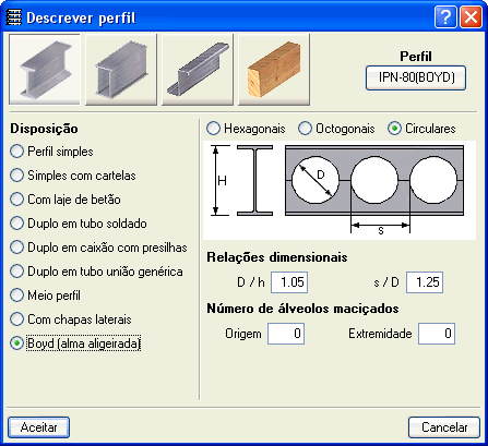 No diálogo Descrever perfil pode-se optar por perfis laminados, compostos, enformados ou secções de madeira. Como novidade as vigas Boyd (alma aligeirada).