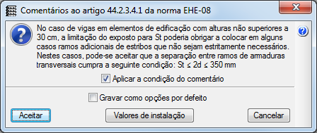 Visto que se trata de um comentário à norma, não é de cumprimento obrigatório, sendo a sua aplicação dependente do critério do projectista. A versão 2012.k do CYPECAD activa esta opção por defeito para obras novas que se iniciem com esta versão. Para obras de versões anteriores que se abram com a 2012.k, a opção não aparece activa por defeito, de modo que os resultados sejam os mesmos que na versão anterior. Em qualquer caso, o utilizador pode activar ou desactivar seleccionando a opção Aplicar a condição do comentário do diálogo Comentários ao artigo 44.2.3.4.1 da norma EHE-08 (menu Obra> Dados gerais> ícone Opções > botão Opções de vigas> Opção Comentários ao artigo 44.2.3.4.1 da norma EHE-08). Recorde que para activar esta opção, deve ter seleccionada a norma EHE-08 no CYPECAD.