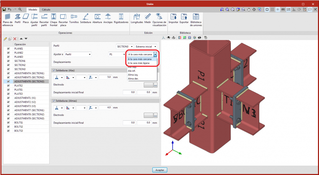 Se han implementado dos opciones para ajustar un perfil o unir una chapa frontal "A la cara más cercana" o "A la cara más lejana" de perfiles. Hasta la versión 2022.c era necesario seleccionar la parte del perfil a la que deseábamos ajustar o unir (dependiendo de la operación). Con las nuevas opciones implementadas, el programa detectará la cara automáticamente.