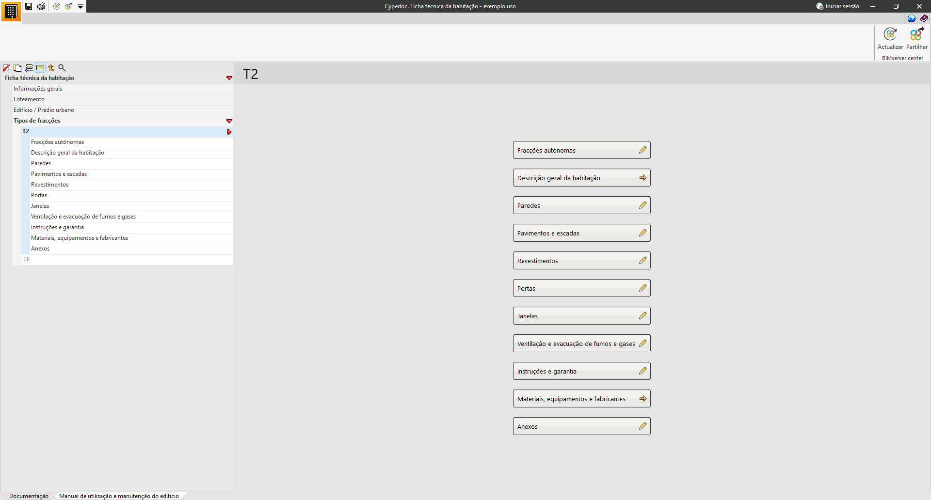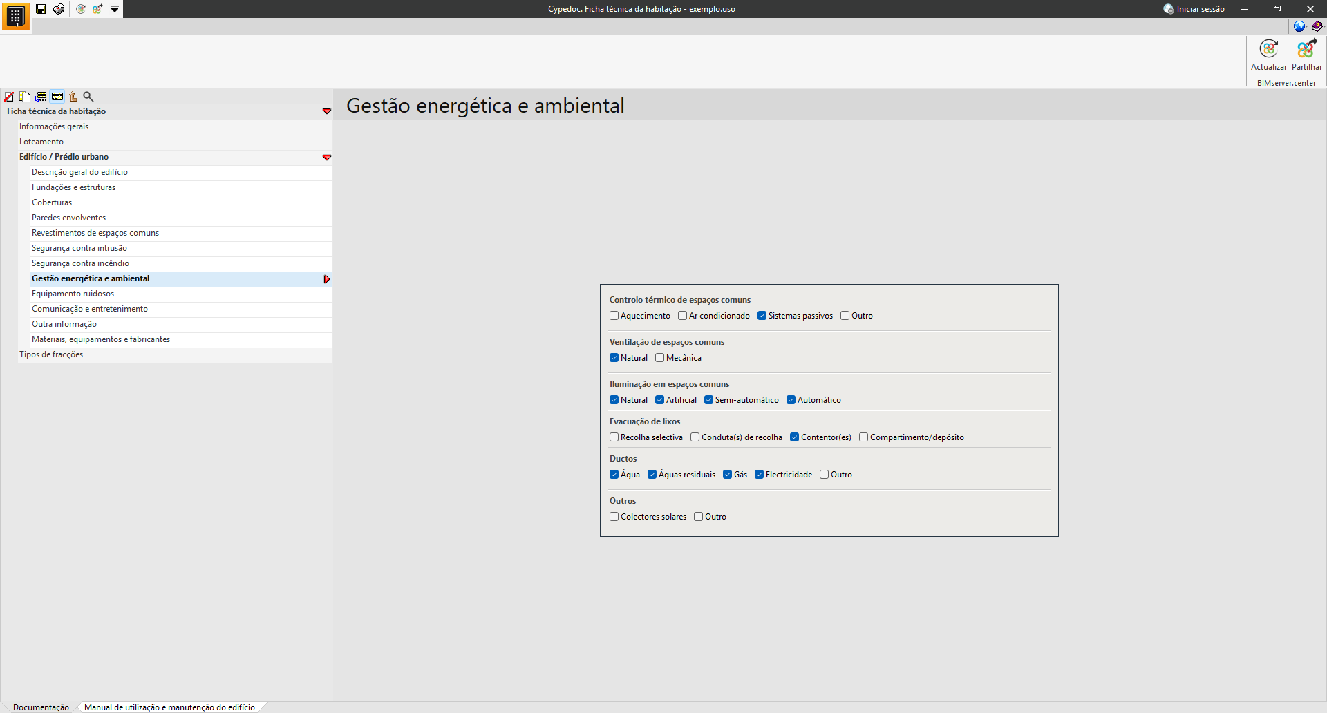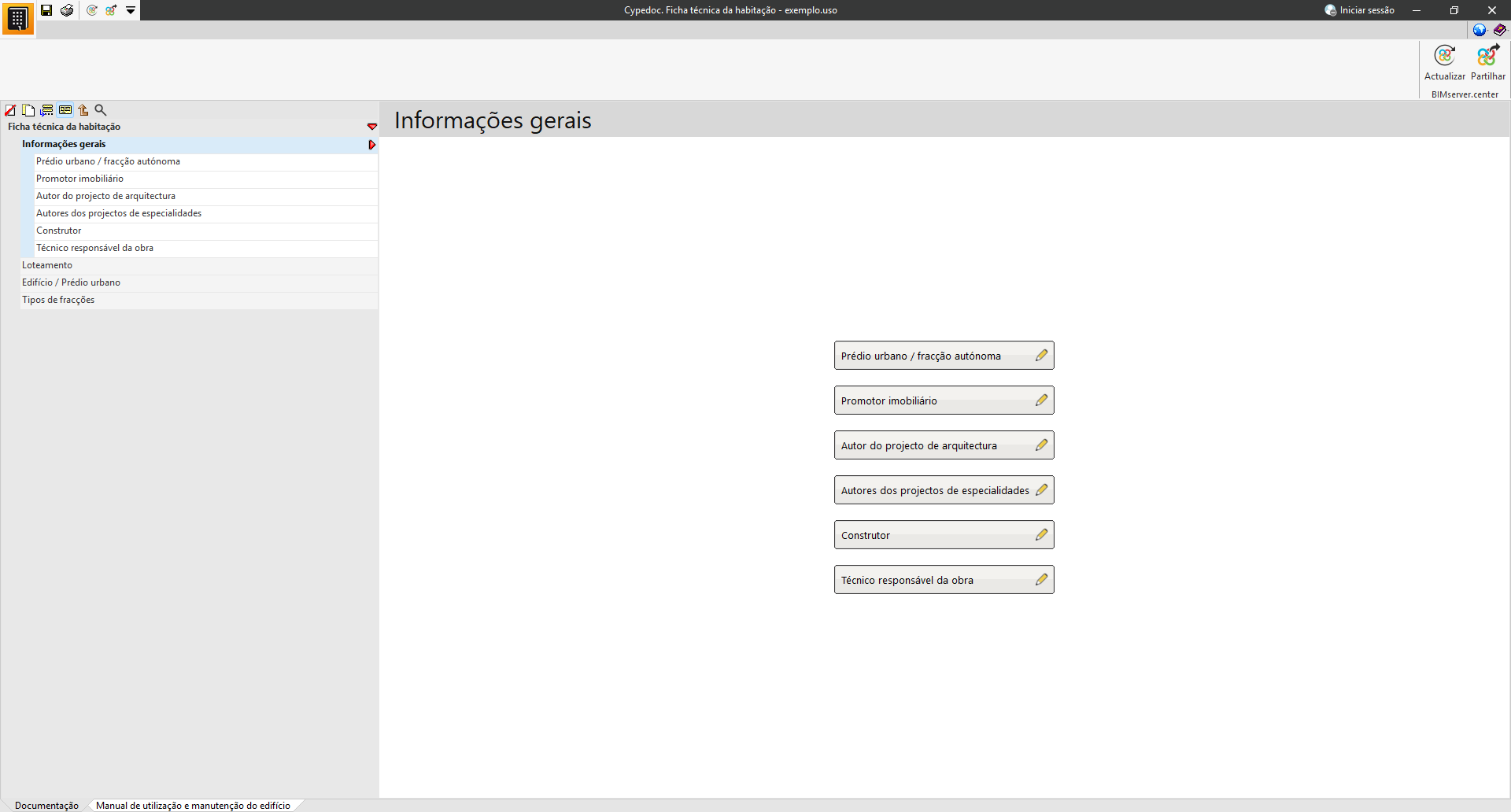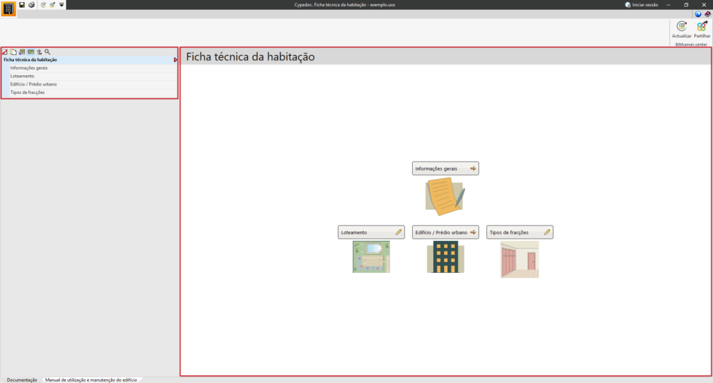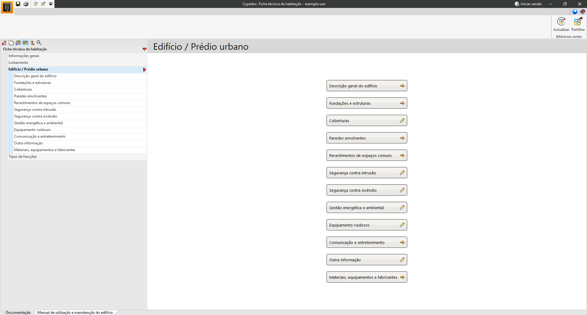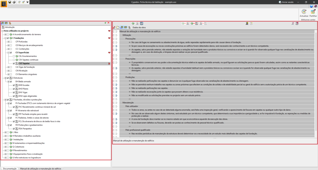 Na secção «Manual de utilização e manutenção do edifício», é possível selecionar a documentação relativa às instruções de utilização, conservação e manutenção do edifício projetado.