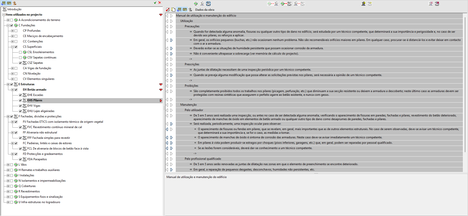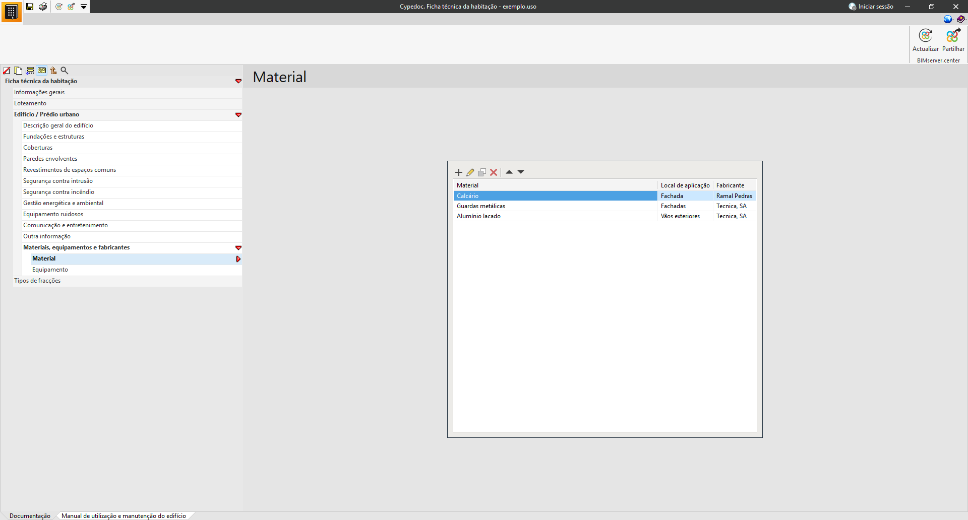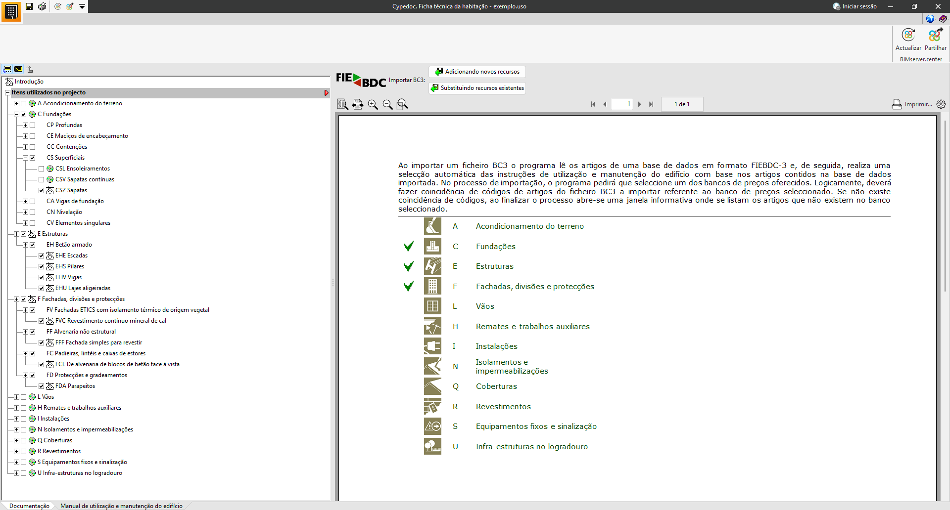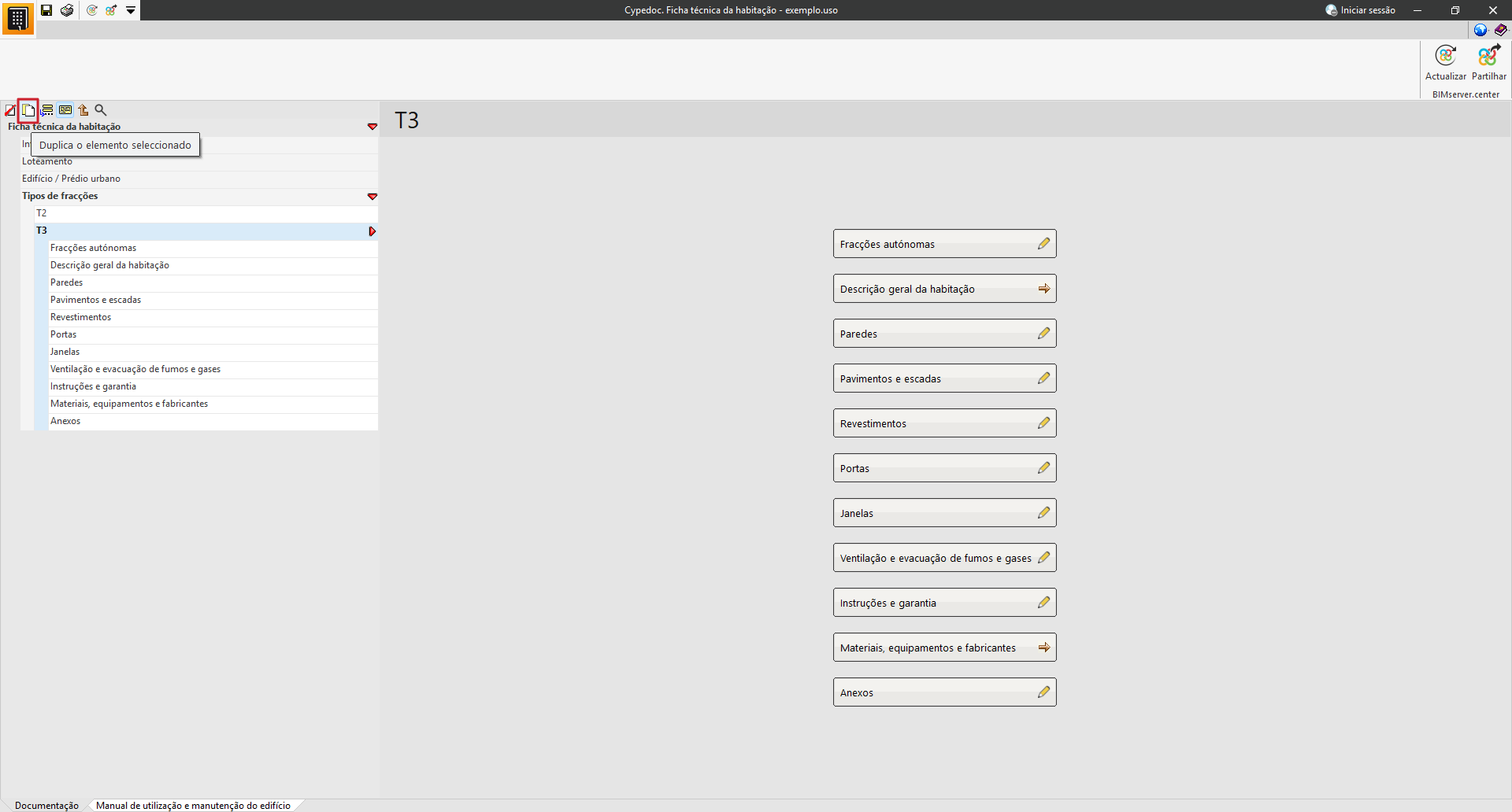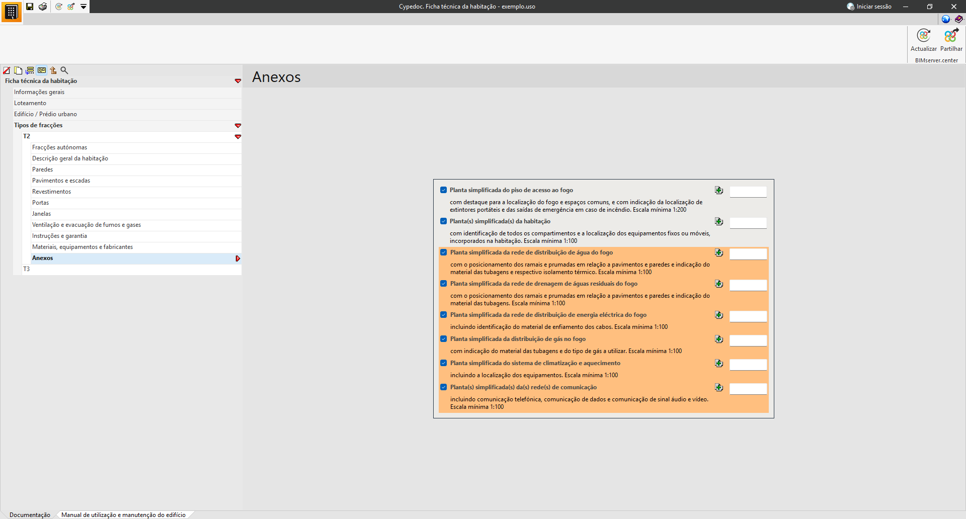 Na secção «Manual de utilização e manutenção do edifício», é possível selecionar a documentação relativa às instruções de utilização, conservação e manutenção do edifício projetado.