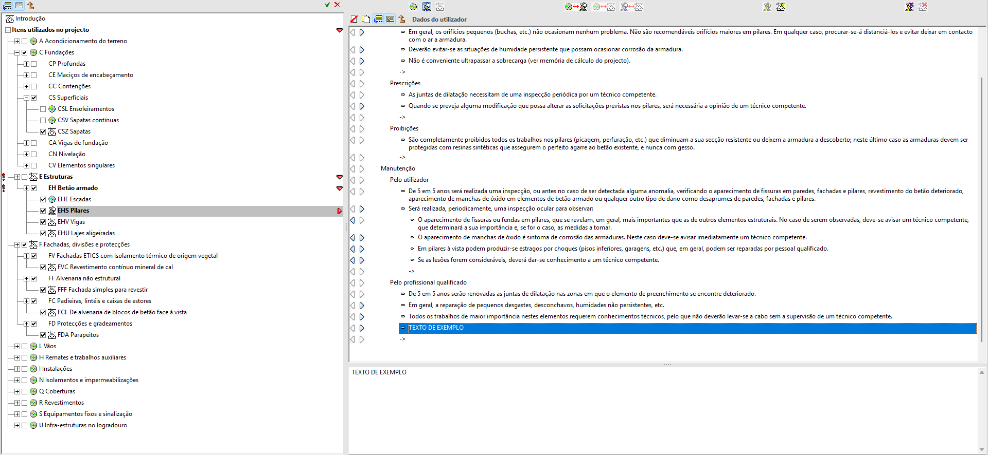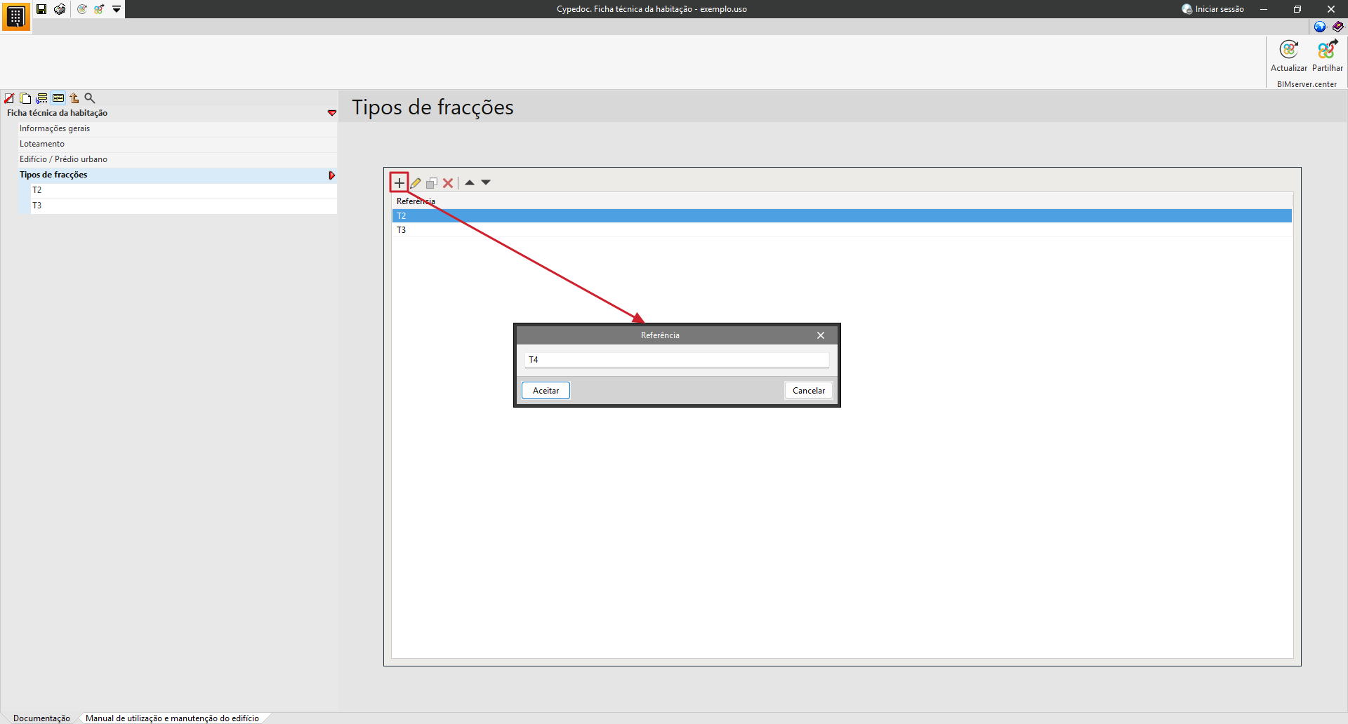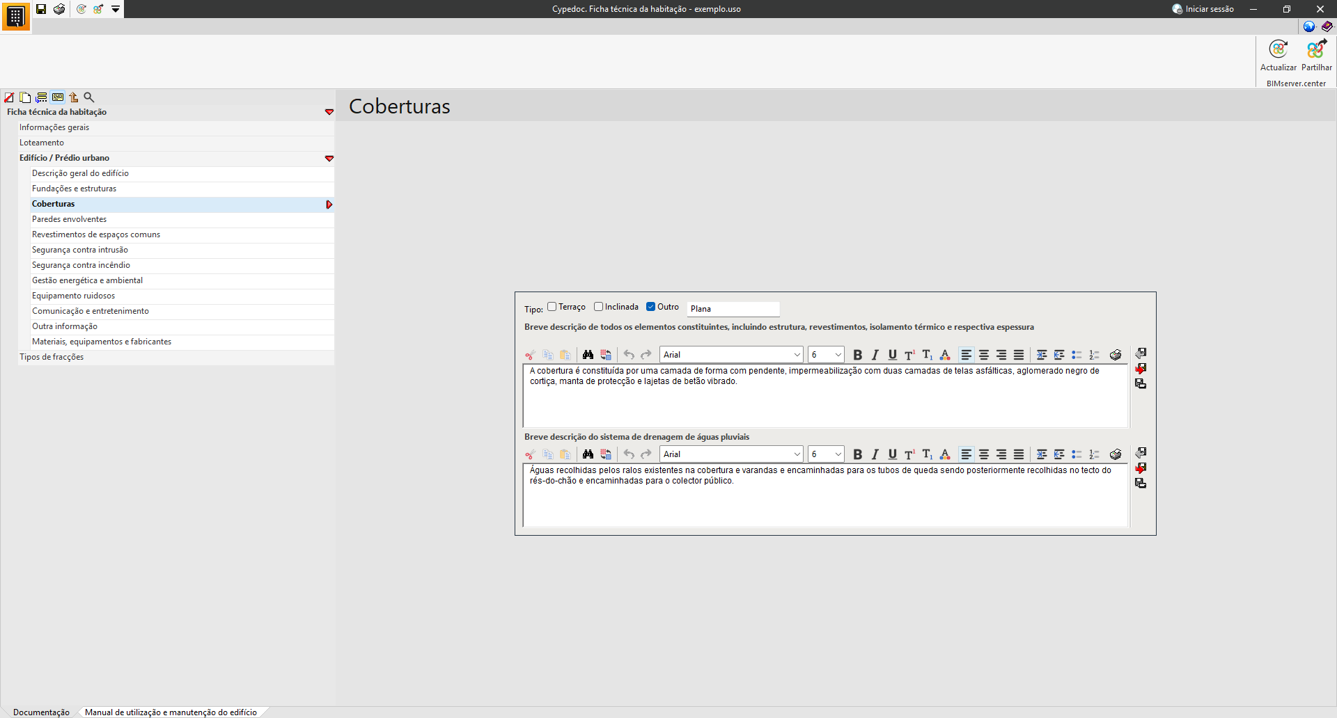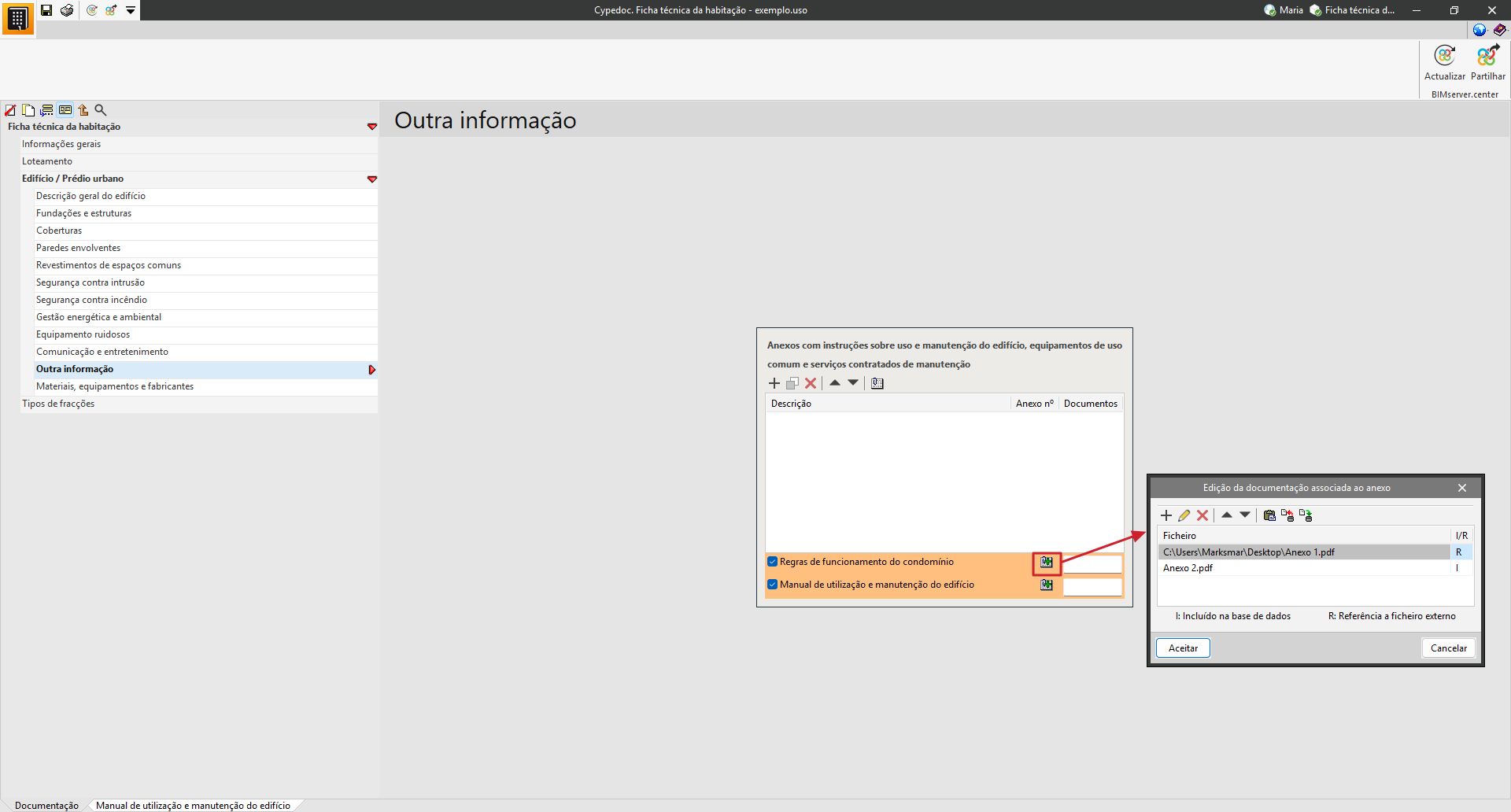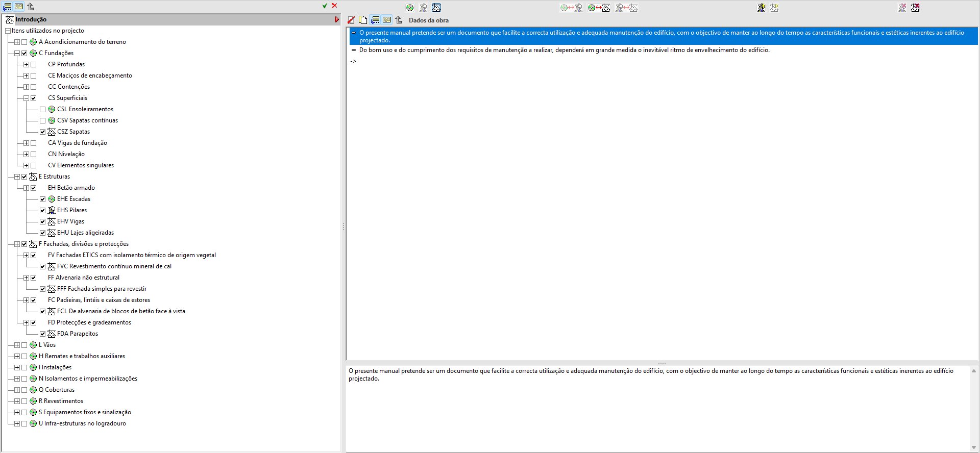 Na secção «Manual de utilização e manutenção do edifício», é possível selecionar a documentação relativa às instruções de utilização, conservação e manutenção do edifício projetado.
