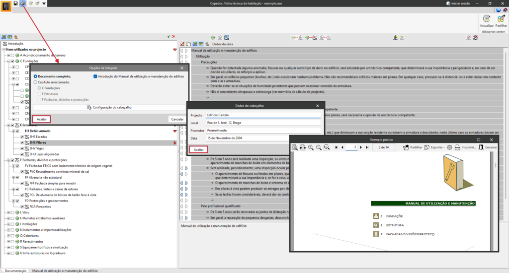 Ao imprimir o «Manual de utilização e manutenção do edifício», incluir-se-ão os dados associados ao capítulo ou item que tenham estas caixas activadas. - Caixa de fechar