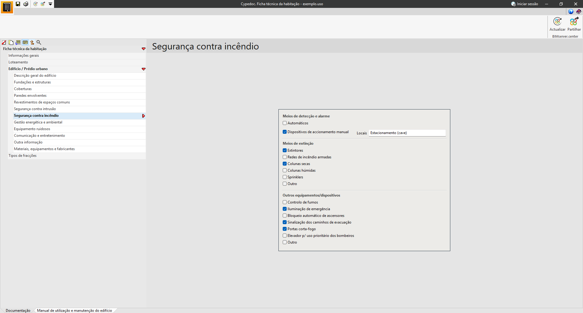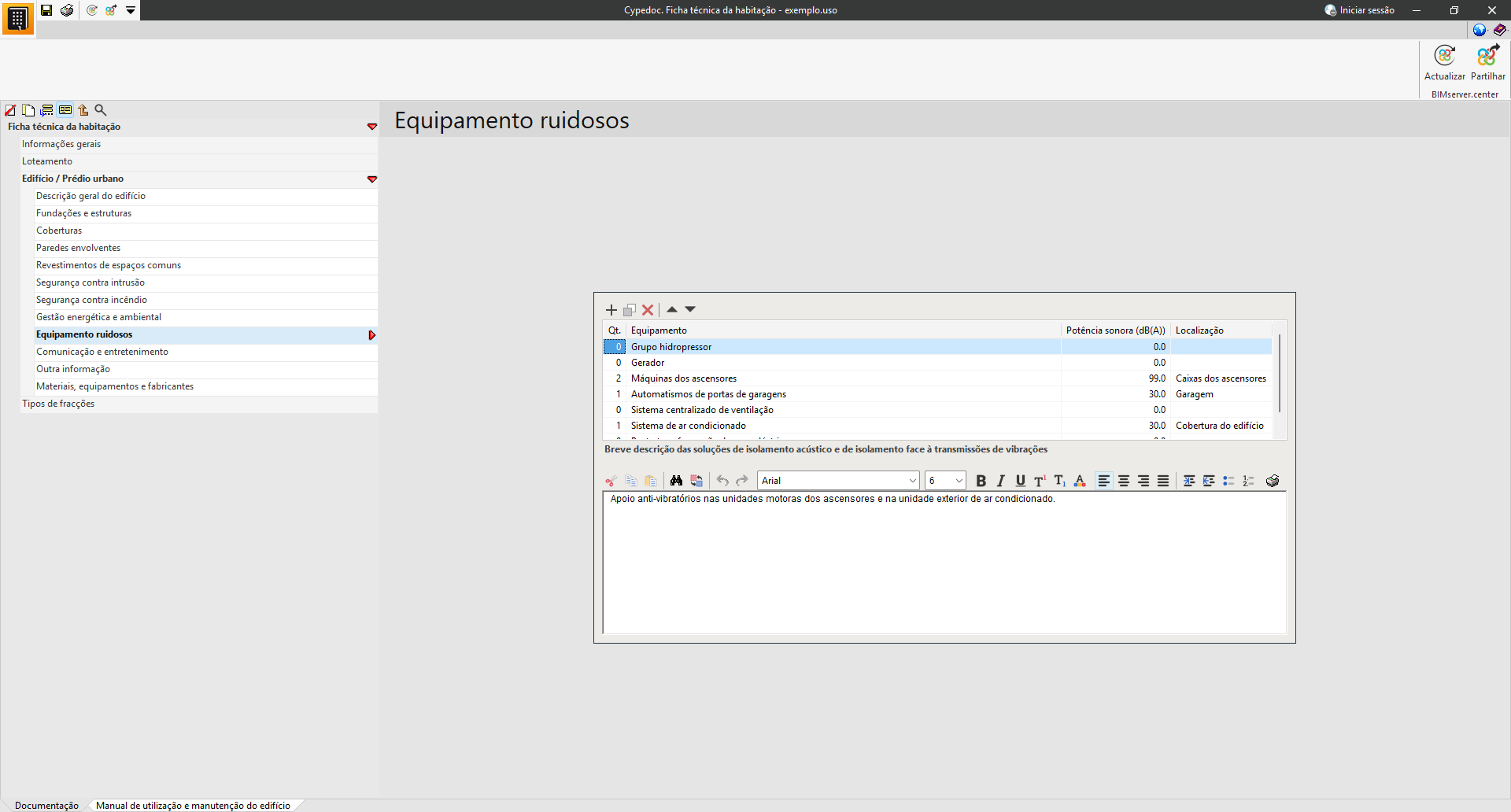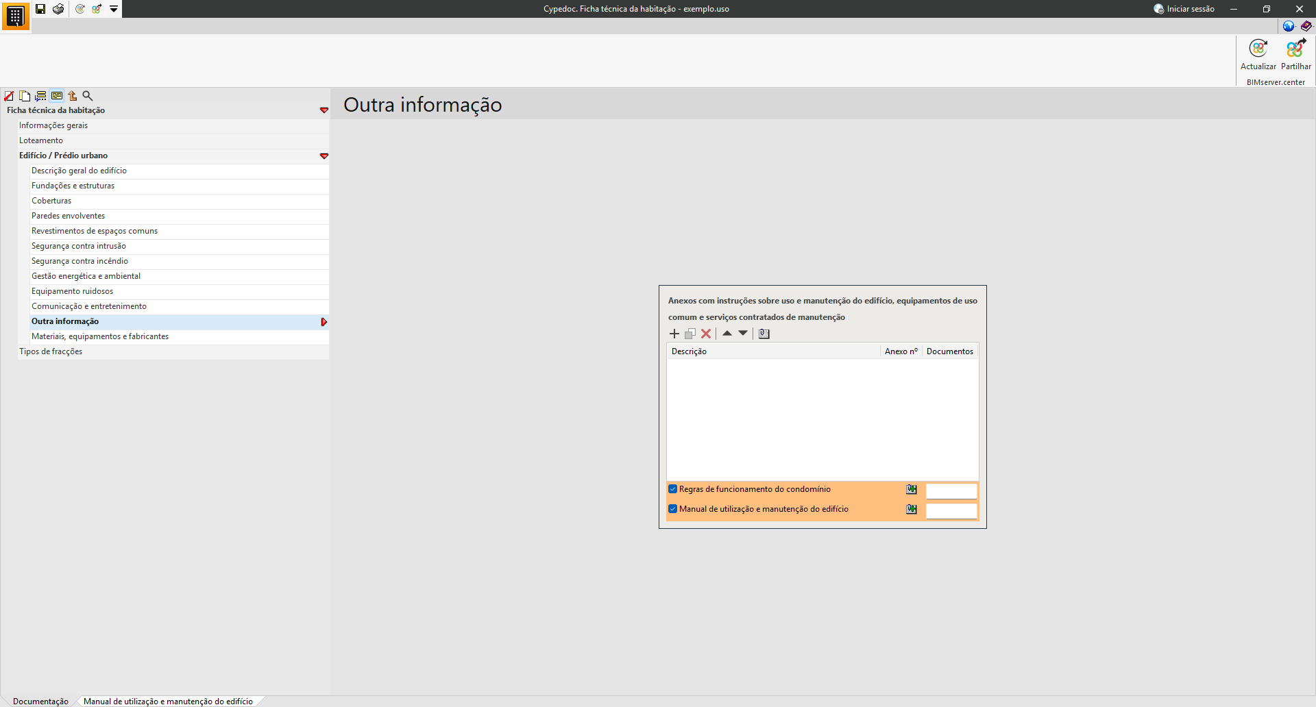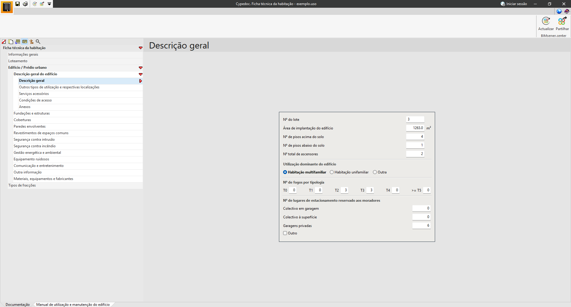 Na secção «Documentação», é possível introduzir os dados técnicos e administrativos do edifício.