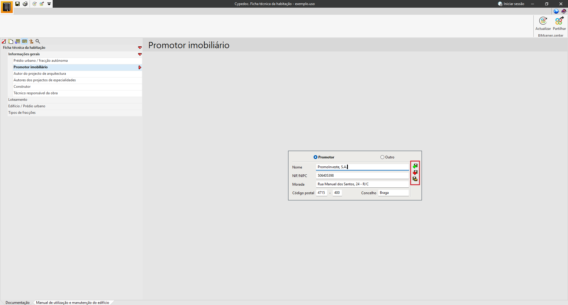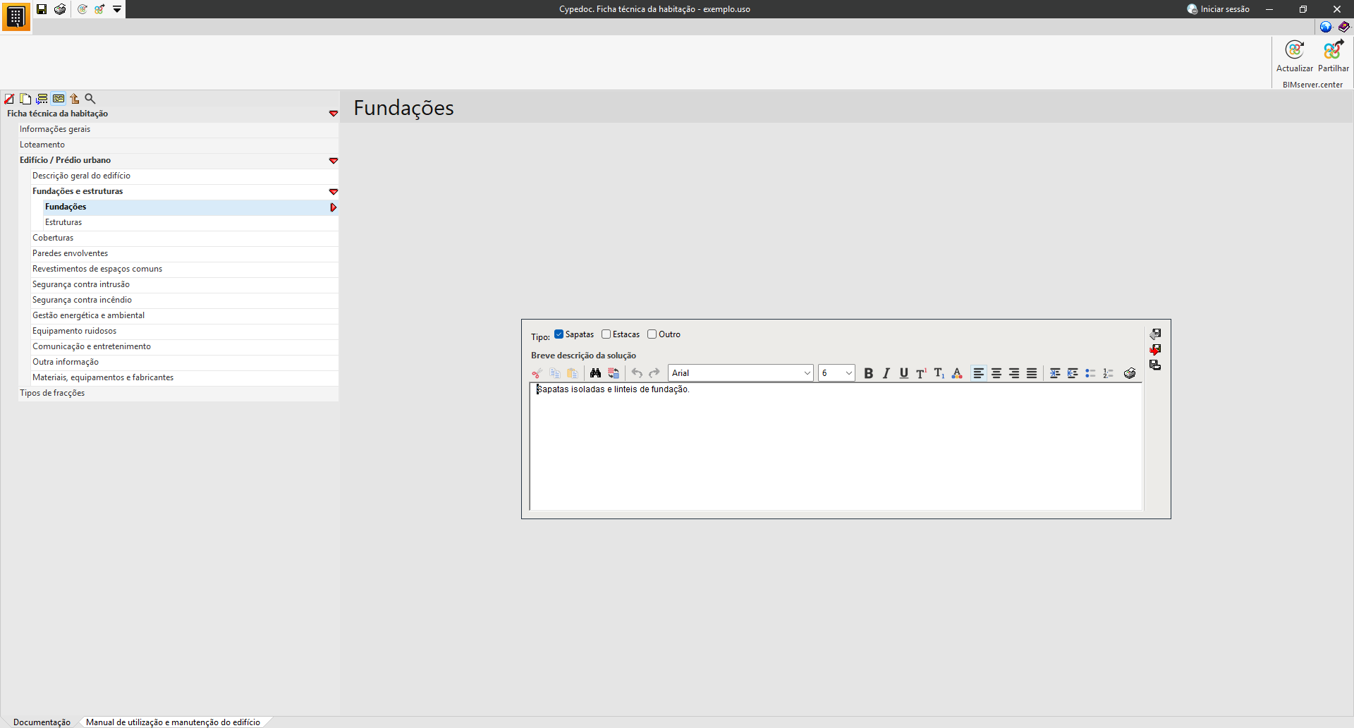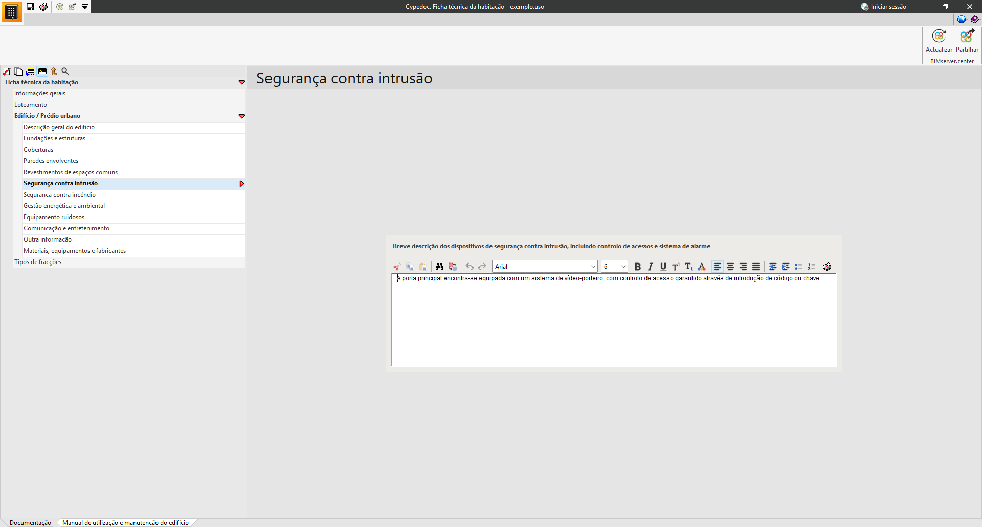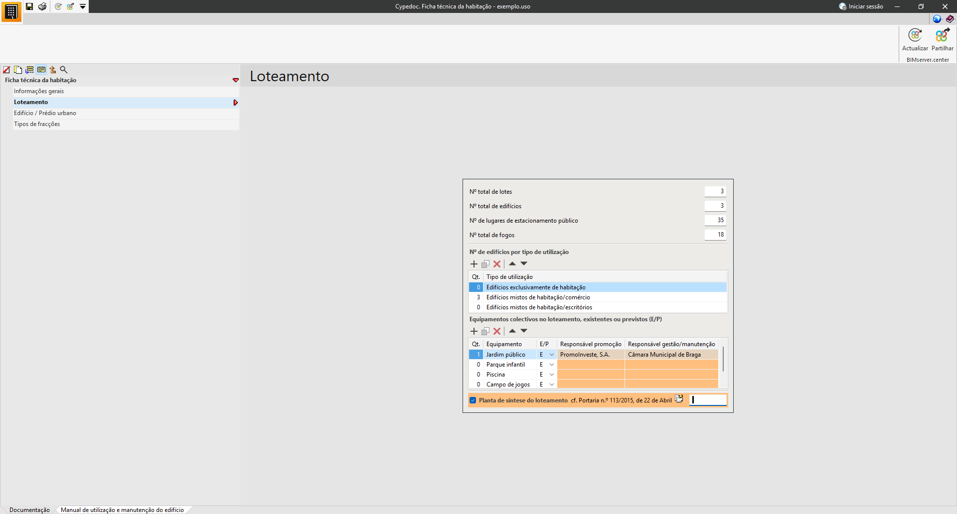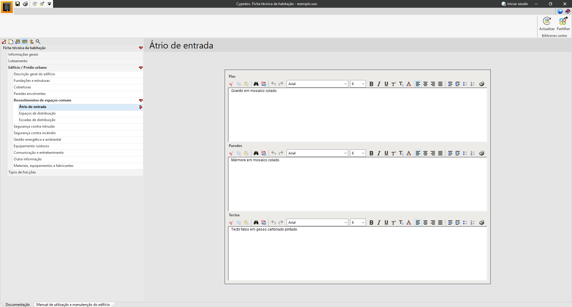 Na secção «Documentação», é possível introduzir os dados técnicos e administrativos do edifício.