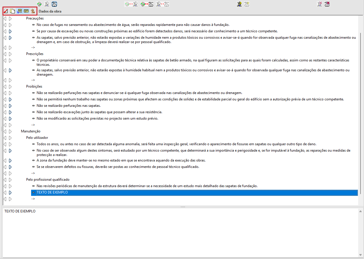 Na barra de ferramentas superior encontram-se as principais ferramentas para editar as instruções de utilização e manutenção dos capítulos e dos itens: