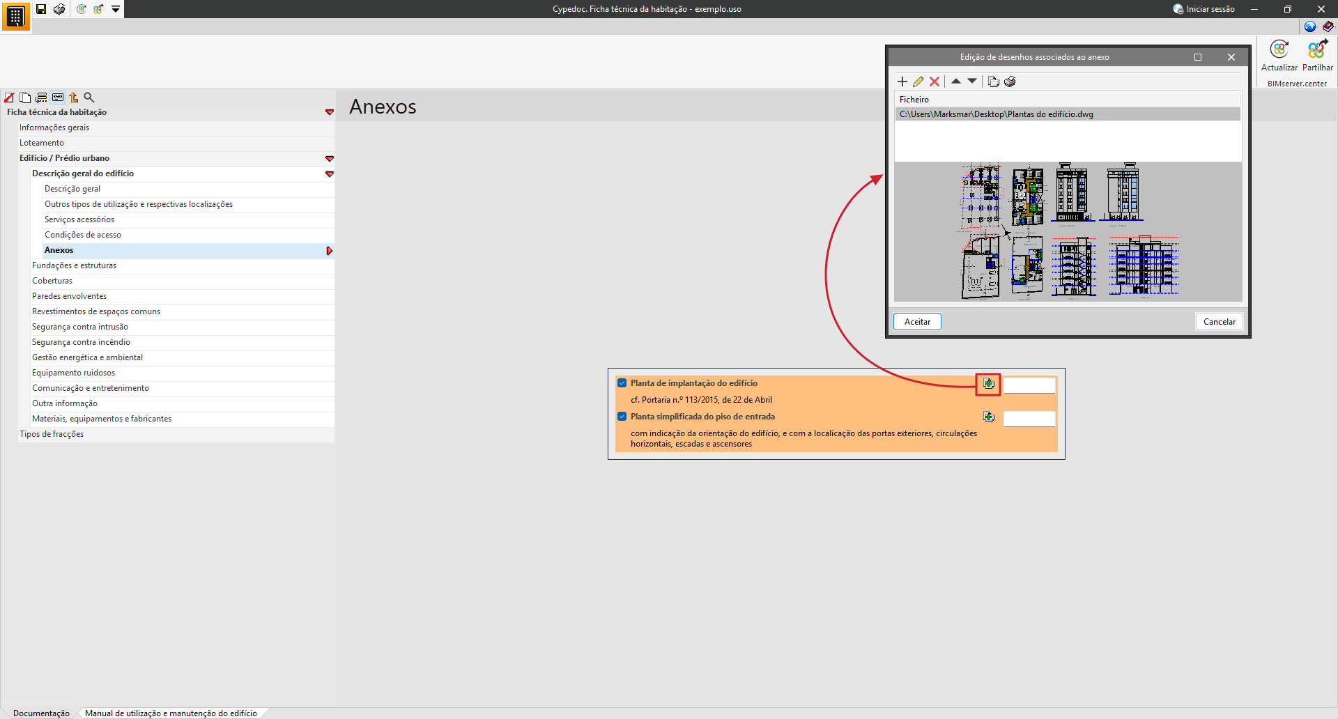 Para consultar ou incluir um ficheiro como anexo gráfico, deve premir-se o botão com o sinal «+», situado à direita do nome do anexo (por exemplo, Planta de implantação do edifício ou Planta simplificada do piso de entrada). Esta ação abre a janela «Edição de desenhos associados ao anexo».