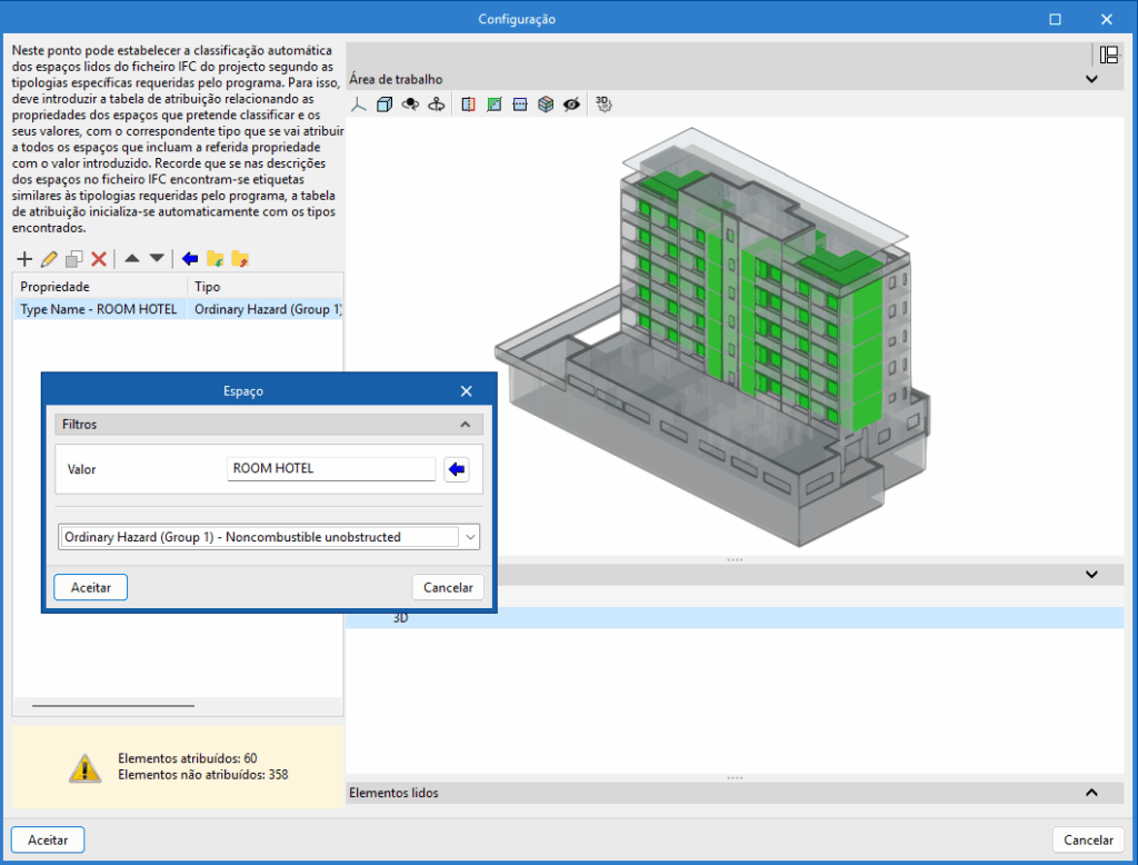 - Finalmente, no último passo é possível estabelecer a classificação automática dos espaços lidos do ficheiro IFC do projeto de acordo com as tipologias específicas requeridas pelo programa.