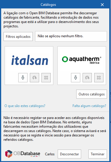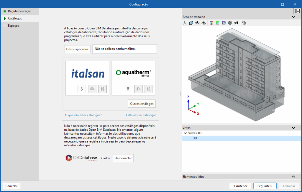 - No passo seguinte, pode ser estabelecida a ligação com a Open BIM Database para realizar a descarga e gestão de catálogos de fabricante. Estes catálogos estarão disponíveis no momento da introdução de elementos da instalação.