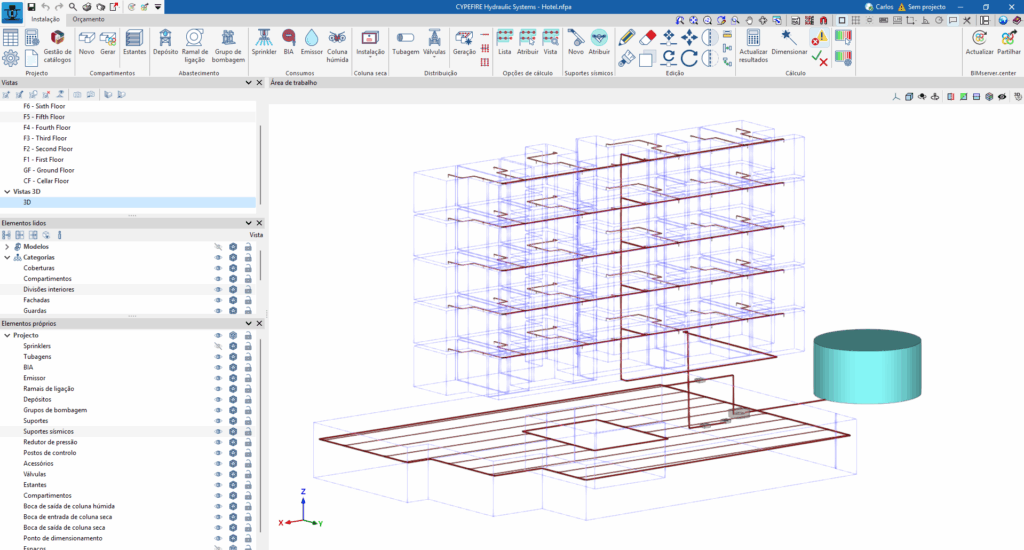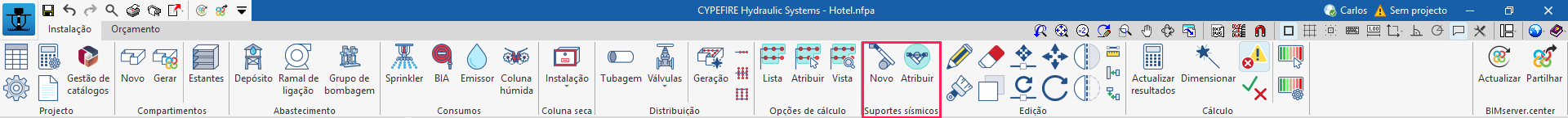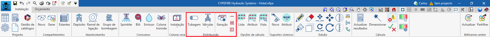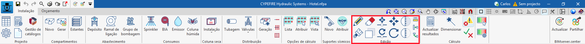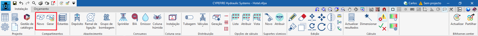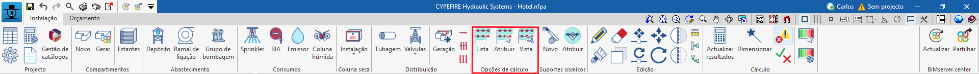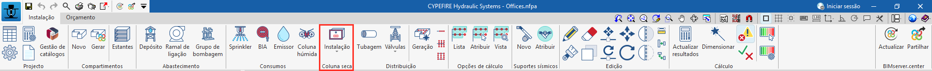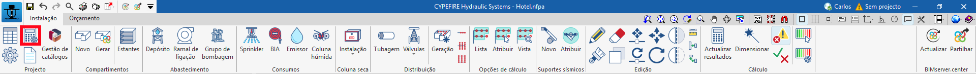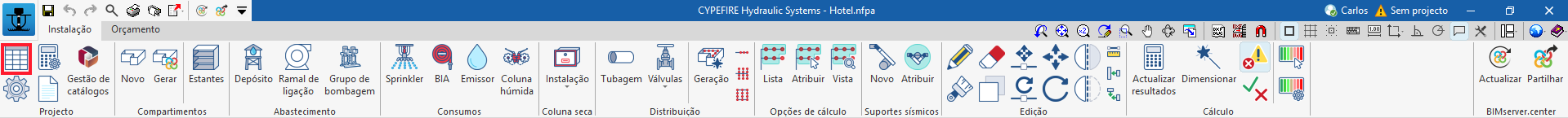- Uma barra de ferramentas superior onde se encontram as ferramentas para: gerir as características gerais do projeto; introduzir e gerar compartimentos; introduzir os pontos de abastecimento, os consumos (sprinklers, BIA, emissores e bocas de saída para colunas húmidas), as colunas secas e os elementos da rede de distribuição de água; definir as hipóteses de cálculo; introduzir os suportes sísmicos; utilizar as ferramentas de edição; e realizar o cálculo, a verificação e o dimensionamento da instalação.