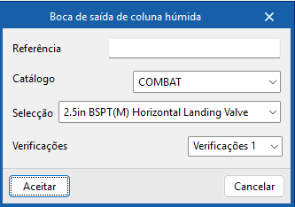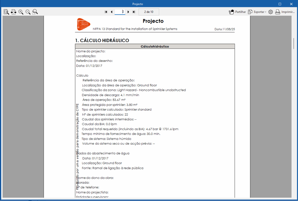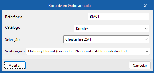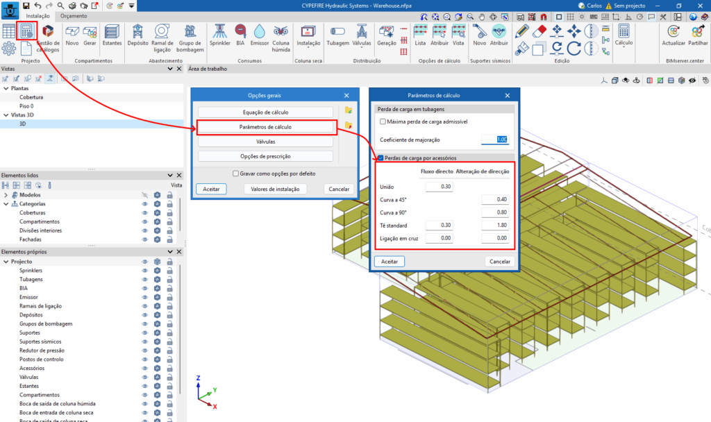 A instalação de extinção de incêndios pode ser definida e calculada no programa utilizando a seguinte sequência de introdução e saída de dados: